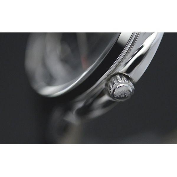 Минималистичный циферблат дополнен стильным узором. Модель оснащена японским автоматическим калибром Orient 46Е40 с запасом хода до 40 часов, противоударное устройство оси баланса обеспечивает лучшую защиту. Ремешок из натуральной кожи имеет рисунок под крокодиловую кожу. Стрелки и метки дополнены люминесцентной подсветкойЛюминесцентное покрытиеПозволяет считывать показания времени в темноте. Производители наносят на стрелки, часовые индексы, безель или поверхность циферблата светонакопительный состав, дающий холодное свечение.. Функции: отображение числа, дня недели.