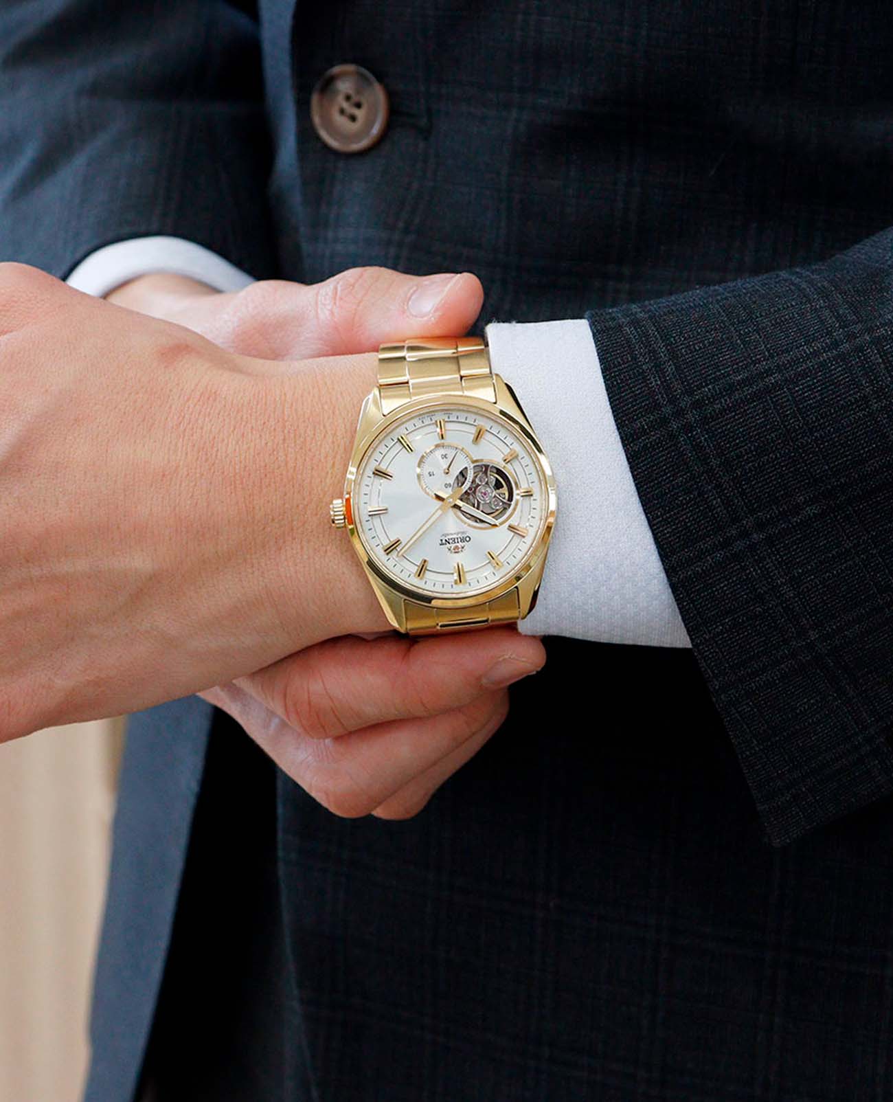 Циферблат выполнен в белом цвете с полускелетонным дизайном, который открывает вид на механизм в области 9 часов. На циферблате расположены светящиеся метки и стрелки с люминесцентным покрытиемЛюминесцентное покрытиеПозволяет считывать показания времени в темноте. Производители наносят на стрелки, часовые индексы, безель или поверхность циферблата светонакопительный состав, дающий холодное свечение., обеспечивающие хорошую видимость в темноте. Также предусмотрено окно малой секундной стрелки на позиции 6 часов, что добавляет часам уникальный и стильный вид.