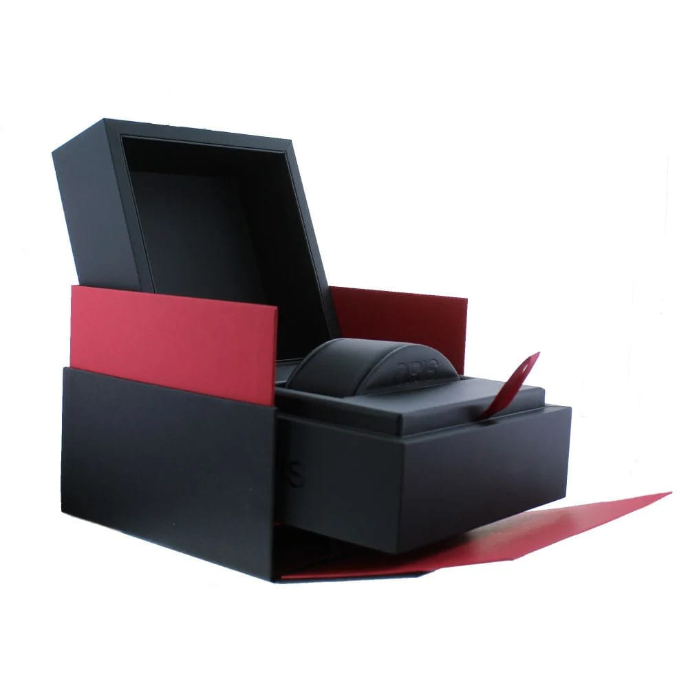 Многокомпонентный корпус из нержавеющей стали, керамический безельБезельВнешний ободок, закрепляющий стекло. В спортивных часах так называется поворотное кольцо с делениями на циферблате, выполняет роль таймера – замеряет отрезки времени на шкале. Неподвижный безель – элемент декора. Однонаправленно вращающийся безель на дайверских часах позволяет фиксировать моменты погружения и выныривания на поверхность. с минутной шкалой. Сапфировое стеклоСапфировое стеклоПрочный и надёжный материал из кристалла сапфира синтетического происхождения, характеризующийся особой твёрдостью и устойчивостью к царапинам и повреждениям., выпуклое с обеих сторон, внутреннее антибликовое покрытие. Прозрачная задняя крышка из минерального стеклаМинеральное стеклоМинеральное стекло представляет собой искусственно выращенный минерал кварца. Такое стекло отличается особой устойчивостью к повреждениям и царапинам. Уступает по некоторым качествам сапфировому стеклу.. Стрелки и метки с люминесцентным покрытиемЛюминесцентное покрытиеПозволяет считывать показания времени в темноте. Производители наносят на стрелки, часовые индексы, безель или поверхность циферблата светонакопительный состав, дающий холодное свечение.. Завинчивающаяся заводная головка. Каучуковый ремень.