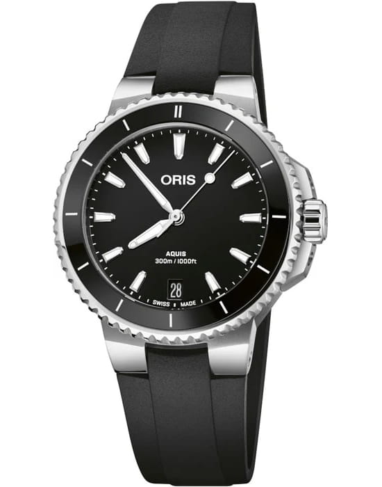 Компания Oris оснастила универсальную модель Aquis Date 36,50 мм спортивным, но элегантным корпусом из нержавеющей стали, надежным автоматическим механизмом Swiss Made, водонепроницаемостью до 30 бар (300 метров) и сменными ремешками. Результат? Прекрасные высокопроизводительные часы.