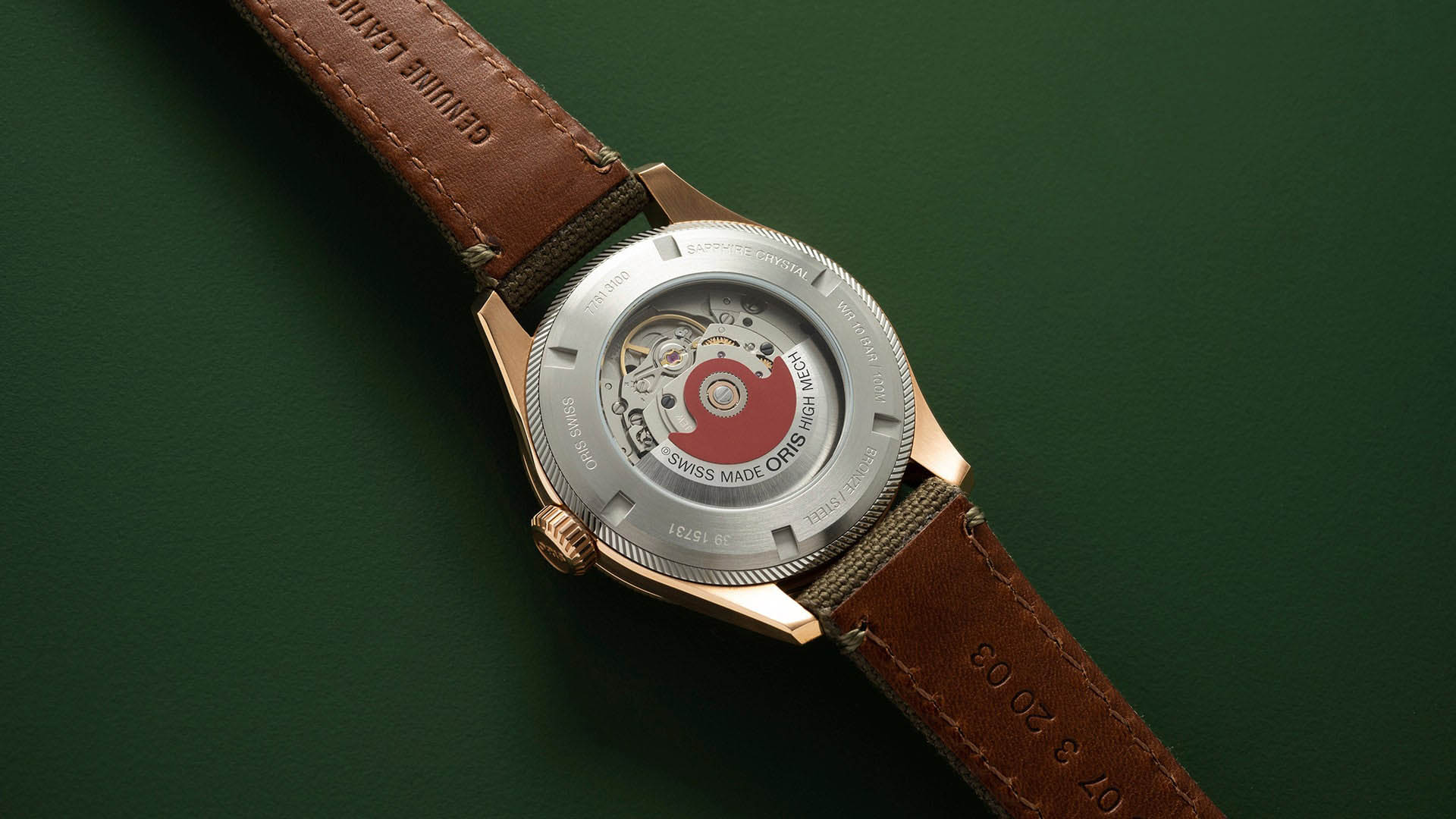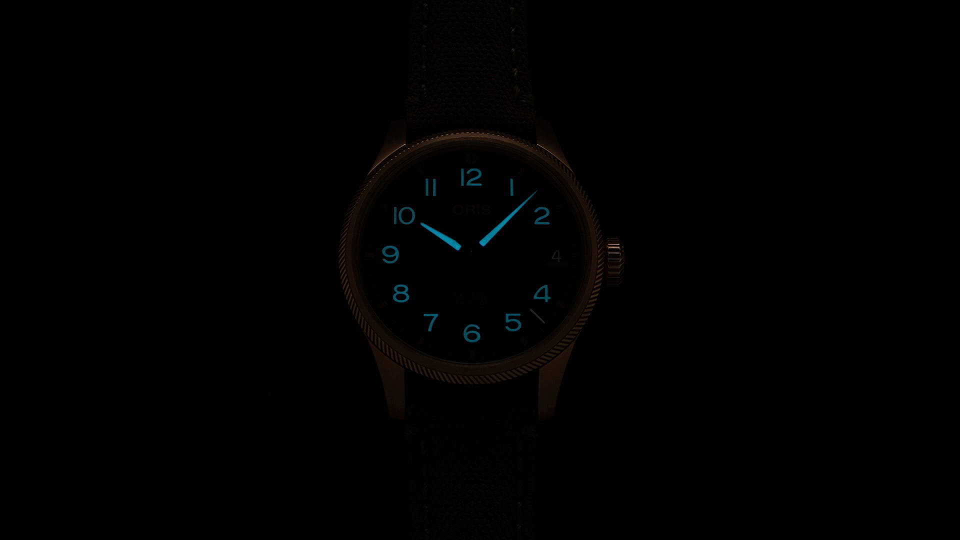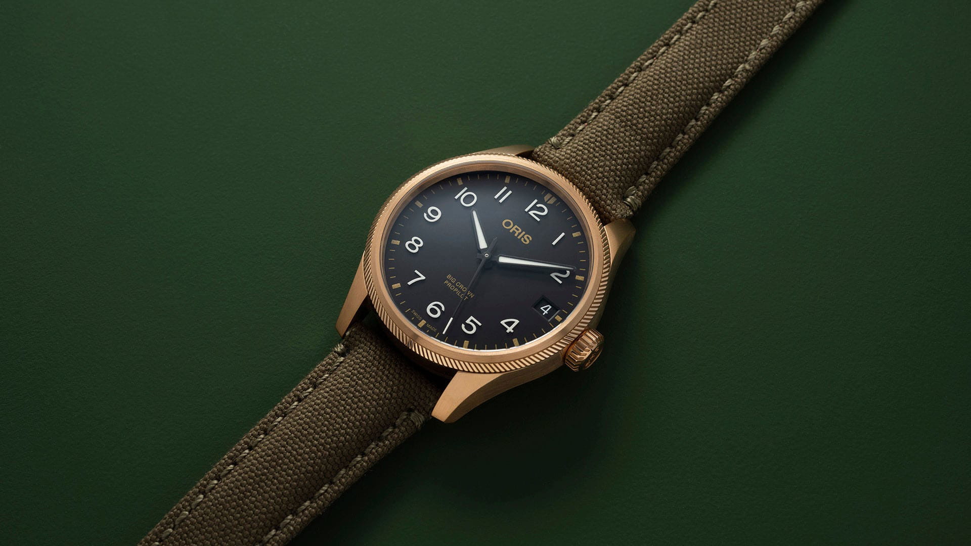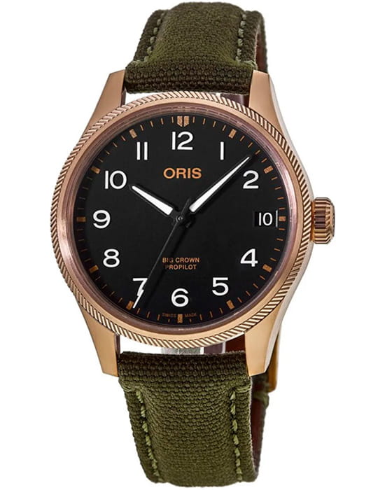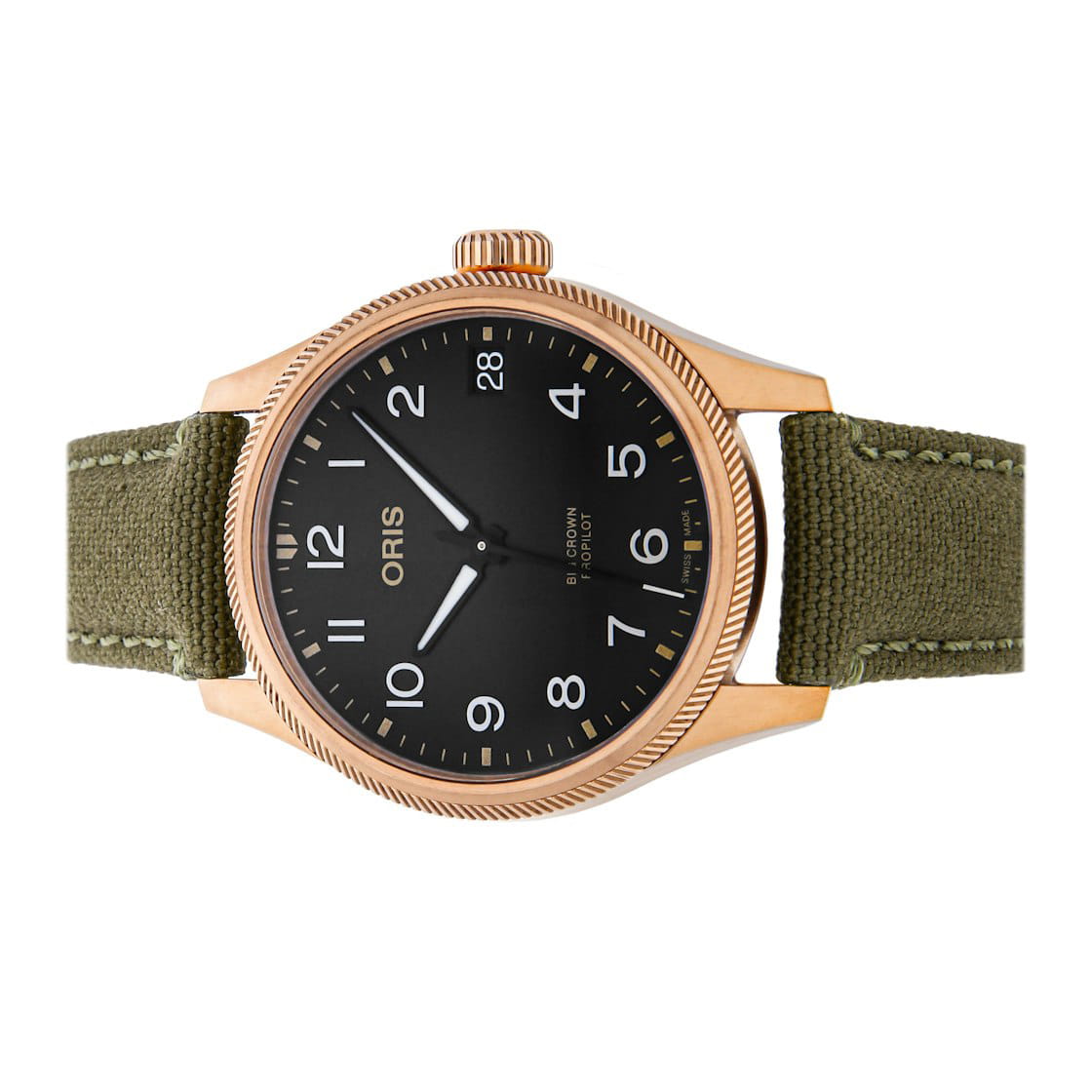 Oris Big Crown ProPilot Big Date теперь имеют бронзовые корпус, безель и заводную головку. Чёрный циферблат с золотистыми индексами и стрелками Super LumiNova® обеспечивает хорошую читаемость.