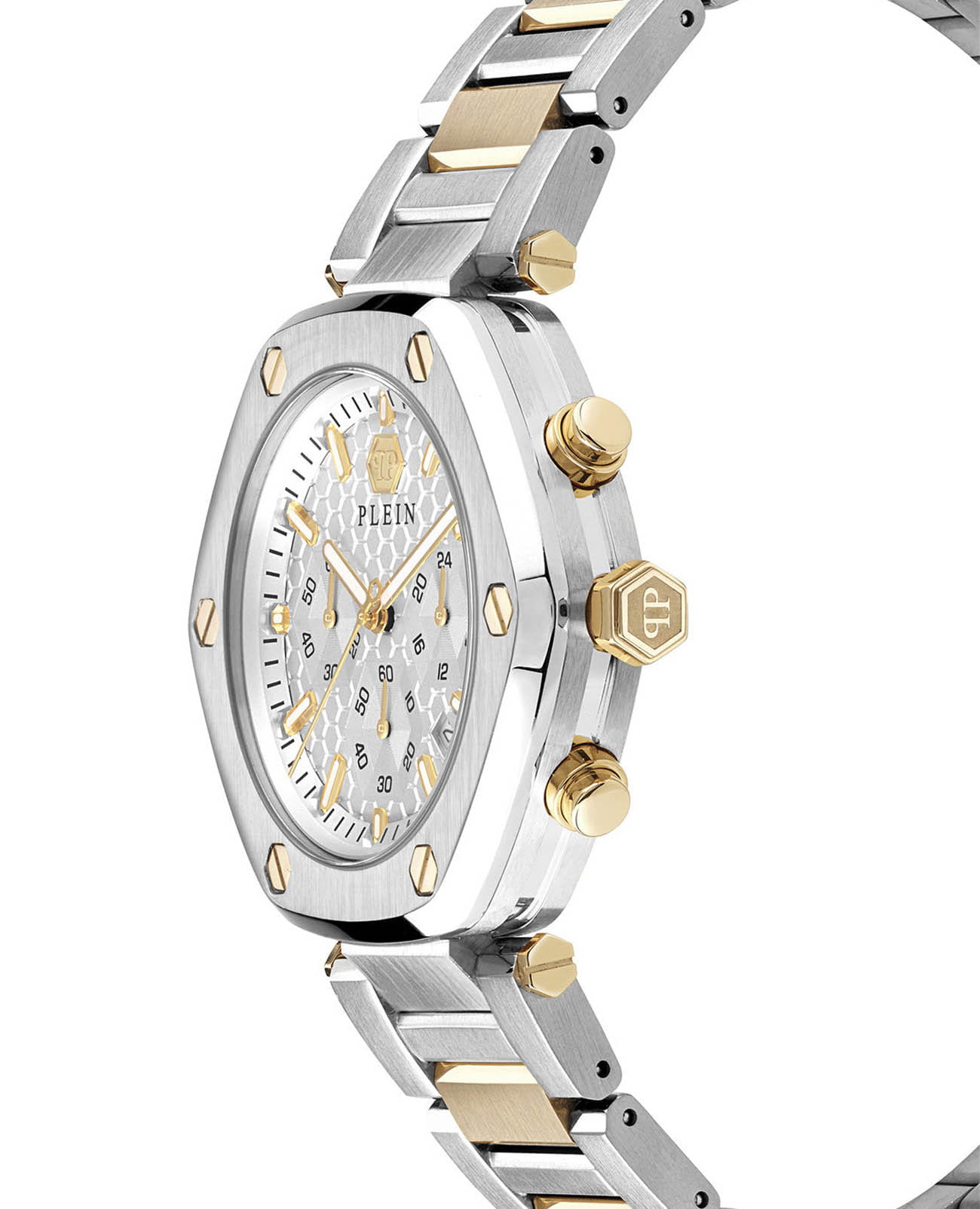 Мужские часы c хронографомХронографФункция позволяет измерять отрезки времени с особой точностью: часы, минуты, секунды. Верным признаком хронографа является наличие на циферблате 3 дополнительных окошек-счётчиков. Philipp Plein The Hexagon Chrono PWZBA0423 с надежным кварцевым механизмом. Корпус часов изготовлен из нержавеющей стали. Минеральное стеклоМинеральное стеклоМинеральное стекло представляет собой искусственно выращенный минерал кварца. Такое стекло отличается особой устойчивостью к повреждениям и царапинам. Уступает по некоторым качествам сапфировому стеклу. устойчивое к мелким механическим повреждениям. Влагозащита: 50 метров, позволит защитить корпус от случайных брызг или капель дождя. Стрелки и метки с люминесцентным покрытиемЛюминесцентное покрытиеПозволяет считывать показания времени в темноте. Производители наносят на стрелки, часовые индексы, безель или поверхность циферблата светонакопительный состав, дающий холодное свечение.. 24-часовой формат на дополнительном циферблате. Стальной браслет с частичным IP-покрытиемIP-покрытиеМетод ионного напыления. Демонстрирует повышенную устойчивость к истиранию, окислению и химическим веществам. Под воздействием высокого давления и температуры около 1500°C молекулы металла надёжно соединяются с частицами корпуса часов. на застёжке-бабочке с кнопкамиЗастёжка "бабочка"Такой вид застёжки дополняется предохранителями, помогающими избежать случайного раскрытия браслета. Обладают изящным исполнением. .
