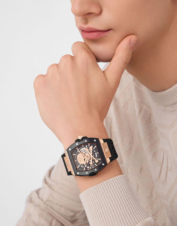 Philipp Plein The $keleton 2.0 PWJFA0225 - это дерзкие и бескомпромиссные часы, воплощающие бунтарский дух бренда. Их отличает узнаваемый мотив черепа, ставший визитной карточкой Philipp Plein, искусно интегрированный в дизайн циферблата. Скелетонизированные мужские механические часы с автоподзаводом. Бочкообразный стальной корпус диаметром 44 мм с PVD-покрытиемPVDУльтратонкое покрытие наносится в технике вакуумного напыления, сочетает в себе нитрид титана особой прочности со слоем золота или оксида хрома. Несёт в себе декоративную или защитную функцию.. Силиконовый ремешок на стандартной застёжке обеспечивает надёжную фиксацию и комфортное ношение. Люминесцентное покрытиеЛюминесцентное покрытиеПозволяет считывать показания времени в темноте. Производители наносят на стрелки, часовые индексы, безель или поверхность циферблата светонакопительный состав, дающий холодное свечение. стрелок и меток позволит следить за временем даже в полной темноте. Метки в виде точек. Минеральное стеклоМинеральное стеклоМинеральное стекло представляет собой искусственно выращенный минерал кварца. Такое стекло отличается особой устойчивостью к повреждениям и царапинам. Уступает по некоторым качествам сапфировому стеклу. защищает циферблат от царапин. Граненая заводная головка. Влагозащита: 50 метров, позволит защитить корпус от случайных брызг или капель дождя. Идеальный аксессуар для тех, кто ценит индивидуальность и не боится выделяться из толпы.