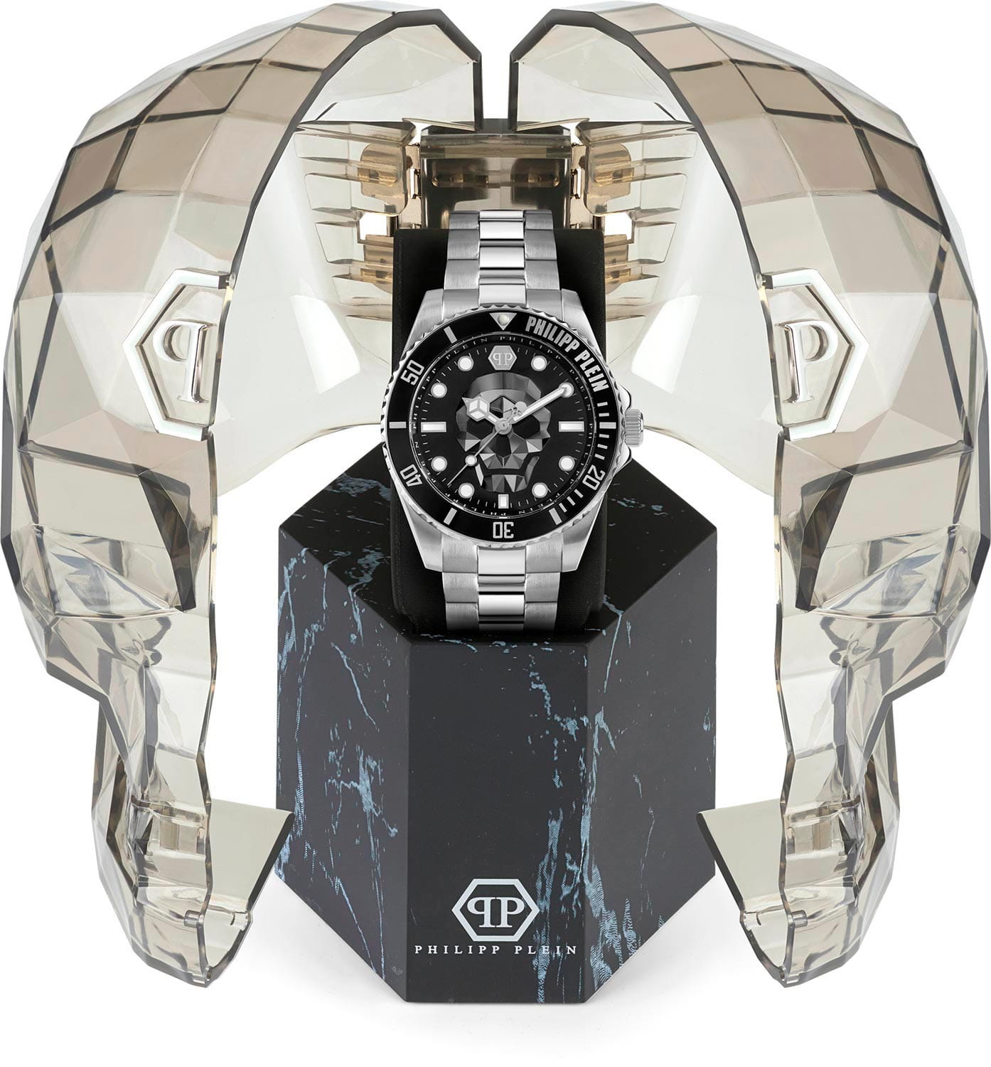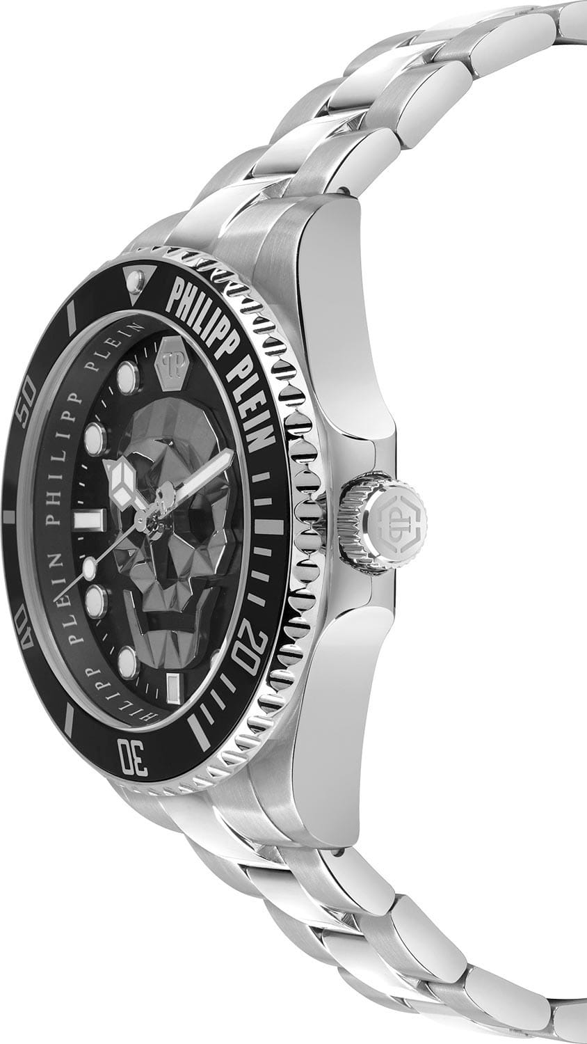 Яркие мужские часы с минеральным стекломМинеральное стеклоМинеральное стекло представляет собой искусственно выращенный минерал кварца. Такое стекло отличается особой устойчивостью к повреждениям и царапинам. Уступает по некоторым качествам сапфировому стеклу. Philipp Plein The Skull PWOAA0522, кварцевый механизм с высокой точностью. Класс водозащиты: 50 метров, позволит защитить корпус от случайных брызг или капель дождя. Корпус часов изготовлен из стали. Циферблат с метками в виде штрихов и точек украшен трехмерным граненым черепом и логотипом. Шестигранная заводная головка с защитой. Застёжка бабочка с кнопкамиЗастёжка "бабочка"Такой вид застёжки дополняется предохранителями, помогающими избежать случайного раскрытия браслета. Обладают изящным исполнением. .