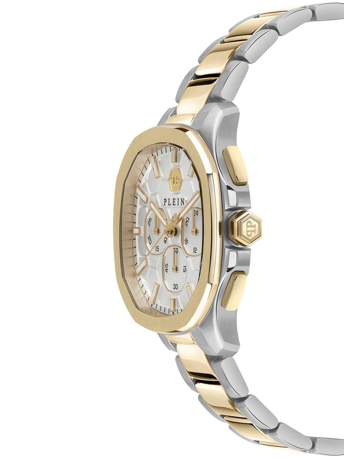 Яркие мужские часы-хронографХронографФункция позволяет измерять отрезки времени с особой точностью: часы, минуты, секунды. Верным признаком хронографа является наличие на циферблате 3 дополнительных окошек-счётчиков. с секундомеромСекундомерСекундоме́р — прибор, способный измерять интервалы времени с точностью до долей секунды. Philipp Plein PWSAA0423, кварцевый механизм с высокой точностью. Класс водозащиты: 50 метров, позволит защитить корпус от случайных брызг или капель дождя. Корпус часов изготовлен из стали с IP-покрытиемIP-покрытиеМетод ионного напыления. Демонстрирует повышенную устойчивость к истиранию, окислению и химическим веществам. Под воздействием высокого давления и температуры около 1500°C молекулы металла надёжно соединяются с частицами корпуса часов.. Стрелки и метки с люминесцентным покрытиемЛюминесцентное покрытиеПозволяет считывать показания времени в темноте. Производители наносят на стрелки, часовые индексы, безель или поверхность циферблата светонакопительный состав, дающий холодное свечение.. Застёжка бабочка с кнопкамиЗастёжка "бабочка"Такой вид застёжки дополняется предохранителями, помогающими избежать случайного раскрытия браслета. Обладают изящным исполнением.