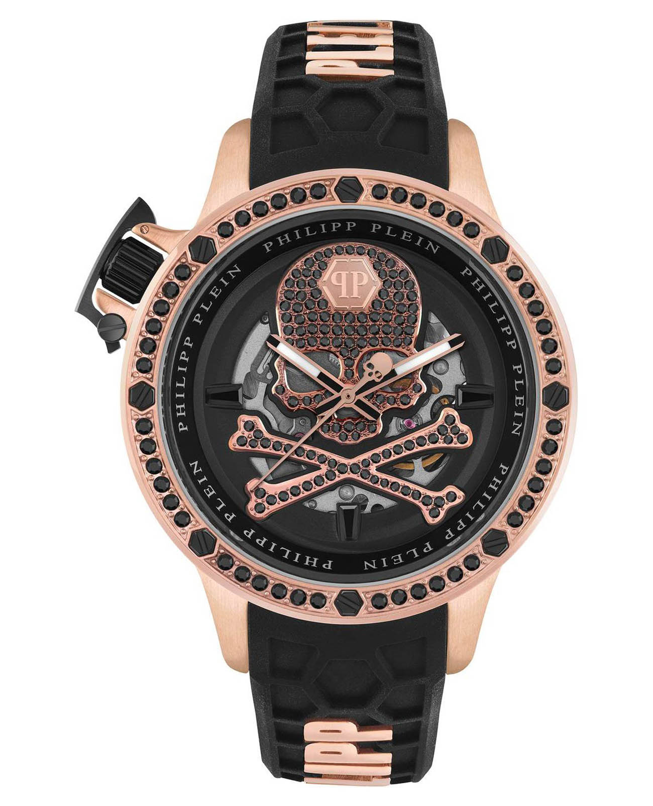 Яркие мужские часы с минеральным стекломМинеральное стеклоМинеральное стекло представляет собой искусственно выращенный минерал кварца. Такое стекло отличается особой устойчивостью к повреждениям и царапинам. Уступает по некоторым качествам сапфировому стеклу. Philipp Plein PWUAA0323, механический механизм с автоподзаводом. Класс водозащиты: 50 метров, позволит защитить корпус от случайных брызг или капель дождя. Корпус часов изготовлен из стали с IP-покрытиемIP-покрытиеМетод ионного напыления. Демонстрирует повышенную устойчивость к истиранию, окислению и химическим веществам. Под воздействием высокого давления и температуры около 1500°C молекулы металла надёжно соединяются с частицами корпуса часов. и украшен кристаллами. Стрелки и метки с люминесцентным покрытиемЛюминесцентное покрытиеПозволяет считывать показания времени в темноте. Производители наносят на стрелки, часовые индексы, безель или поверхность циферблата светонакопительный состав, дающий холодное свечение..