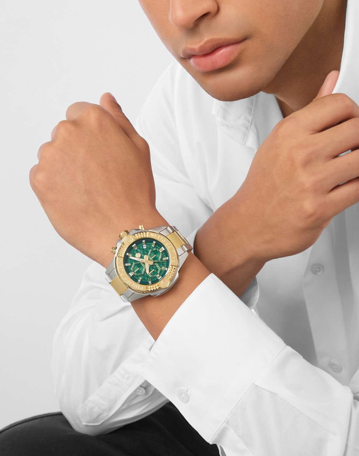 Philipp Plein The $kull Chrono PWWFA0525 - яркие часы-хронографХронографФункция позволяет измерять отрезки времени с особой точностью: часы, минуты, секунды. Верным признаком хронографа является наличие на циферблате 3 дополнительных окошек-счётчиков. в революционном дизайне несомненно добавят вам выразительности и станут главным акцентом вашего стильного образа. Мужские кварцевые часы с высокой точностью. Круглый стальной корпус серебристого цвета, диаметром 44 мм. Метки в виде штрихов. БезельБезельВнешний ободок, закрепляющий стекло. В спортивных часах так называется поворотное кольцо с делениями на циферблате, выполняет роль таймера – замеряет отрезки времени на шкале. Неподвижный безель – элемент декора. Однонаправленно вращающийся безель на дайверских часах позволяет фиксировать моменты погружения и выныривания на поверхность. с PVD-покрытиемPVDУльтратонкое покрытие наносится в технике вакуумного напыления, сочетает в себе нитрид титана особой прочности со слоем золота или оксида хрома. Несёт в себе декоративную или защитную функцию. золотистого цвета. Минеральное стеклоМинеральное стеклоМинеральное стекло представляет собой искусственно выращенный минерал кварца. Такое стекло отличается особой устойчивостью к повреждениям и царапинам. Уступает по некоторым качествам сапфировому стеклу. защищает циферблат от царапин. Люминесцентное покрытиеЛюминесцентное покрытиеПозволяет считывать показания времени в темноте. Производители наносят на стрелки, часовые индексы, безель или поверхность циферблата светонакопительный состав, дающий холодное свечение. стрелок и меток позволит следить за временем даже в полной темноте. Окошко даты находится в положении 4 часа. Стальной браслет с частичным PVD-покрытиемPVDУльтратонкое покрытие наносится в технике вакуумного напыления, сочетает в себе нитрид титана особой прочности со слоем золота или оксида хрома. Несёт в себе декоративную или защитную функцию. на застёжке-бабочке с кнопкамиЗастёжка "бабочка"Такой вид застёжки дополняется предохранителями, помогающими избежать случайного раскрытия браслета. Обладают изящным исполнением. , обеспечивает комфортное ношение. Граненая заводная головка. Влагозащита: 50 метров, позволит защитить корпус от случайных брызг или капель дождя. Идеальный аксессуар для тех, кто ценит индивидуальность и не боится выделяться из толпы.