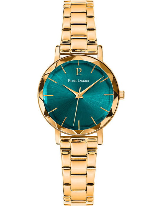 Pierre Lannier 012P562 Multiples — элегантная женская модель, в которой сочетаются современный стиль и утончённая простота. Корпус диаметром 30 мм выполнен из нержавеющей стали с изящным золотистым IP-покрытиемIP-покрытиеМетод ионного напыления. Демонстрирует повышенную устойчивость к истиранию, окислению и химическим веществам. Под воздействием высокого давления и температуры около 1500°C молекулы металла надёжно соединяются с частицами корпуса часов., создающим ощущение тепла и благородства. Циферблат насыщенного зелёного оттенка с эффектом солнечных лучей украшен тонкими золотистыми стрелками и часовыми метками. Композиция оформлена минималистично, подчёркивая утончённость формы и цветовое равновесие. Циферблат защищён прочным минеральным стекломМинеральное стеклоМинеральное стекло представляет собой искусственно выращенный минерал кварца. Такое стекло отличается особой устойчивостью к повреждениям и царапинам. Уступает по некоторым качествам сапфировому стеклу., которое надёжно противостоит повседневным повреждениям. Внутри — точный японский кварцевый механизм, отличающийся стабильностью и долговечностью. Браслет из нержавеющей стали, выполненный в мелком плетении, гармонично дополняет корпус и завершён надёжной раскладной застёжкойРаскладная застёжкаТакой тип застёжки используется только на браслетах из металла. Она никогда не раскрывается полностью, происходит разделение на 2 и более частей. Раскладывающая застёжка снизит вероятность потери часов к минимуму., обеспечивающей комфортное ношение. Водонепроницаемость до 5 ATM делает часы устойчивыми к случайным брызгам и дождю. 012P562 Multiples — это сочетание выразительного цвета, утончённого блеска и точности, подходящее как для повседневного образа, так и для особых случаев.