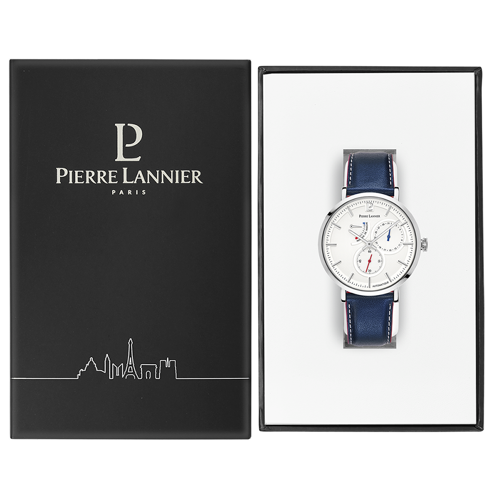 Мужские механические часы с автоподзаводом Pierre Lannier Evidence 327B106. Минеральное стеклоМинеральное стеклоМинеральное стекло представляет собой искусственно выращенный минерал кварца. Такое стекло отличается особой устойчивостью к повреждениям и царапинам. Уступает по некоторым качествам сапфировому стеклу. устойчивое к мелким механическим повреждениям. Центральные часовая и минутная стрелки, секундная стрелка вынесена на малый циферблат. Отображение даты в малом циферблате. Ретроградный индикатор запаса хода. Корпус выполнен из нержавеющей стали. Водостойкость: 50 метров, позволит защитить корпус от случайных брызг или капель дождя. Кожаный ремешок на стандартной застёжке. Стрелки с люминесцентным покрытиемЛюминесцентное покрытиеПозволяет считывать показания времени в темноте. Производители наносят на стрелки, часовые индексы, безель или поверхность циферблата светонакопительный состав, дающий холодное свечение..