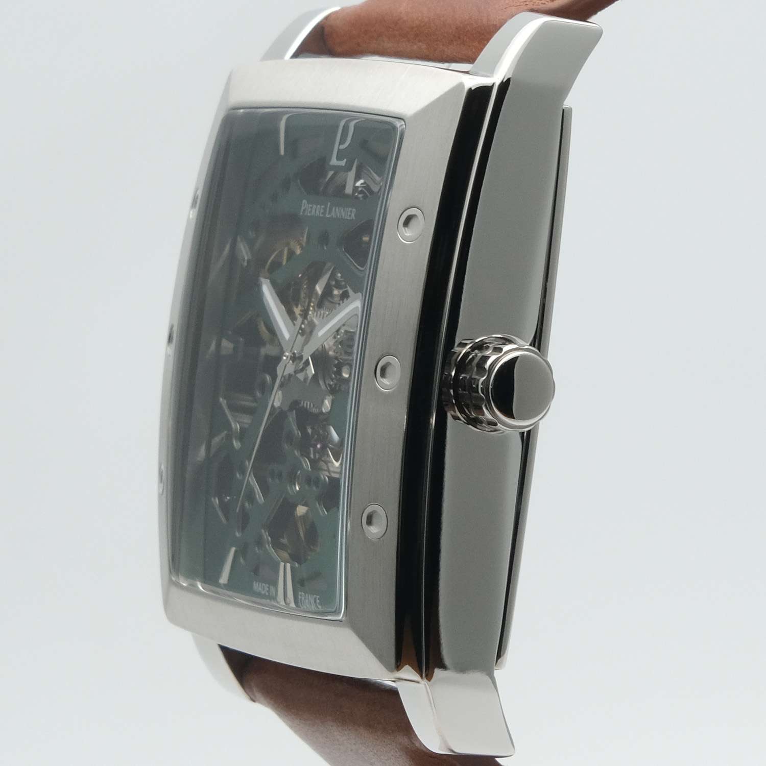 Мужские механические часы Pierre Lannier Hector 342A174 представляют собой уникальное сочетание винтажного стиля и современных технологий с корпусом "тонно" размером 36×42 мм из нержавеющей стали и прозрачным зеленым скелетонизированным циферблатом, раскрывающим работу автоматического механизма. Модель оснащена автоматическим механизмом с ручным подзаводом и 40-часовым запасом хода, демонстрирующим точное движение стрелок через прозрачный циферблат. Защиту обеспечивает устойчивое к царапинам минеральное стеклоМинеральное стеклоМинеральное стекло представляет собой искусственно выращенный минерал кварца. Такое стекло отличается особой устойчивостью к повреждениям и царапинам. Уступает по некоторым качествам сапфировому стеклу., а водонепроницаемость WR50 (5 бар) позволяет использовать часы при плавании в бассейне. Кожаный ремешок из коричневой кожи махагони с перфорацией шириной 26 мм и классической пряжкой добавляет ретро-характер и легко заменяется на другие ремешки коллекции. Особенности включают матово-полированную отделку корпуса, серебристые стрелки и индексы на зеленом циферблате, а также прозрачную заднюю крышку, демонстрирующую механизм.