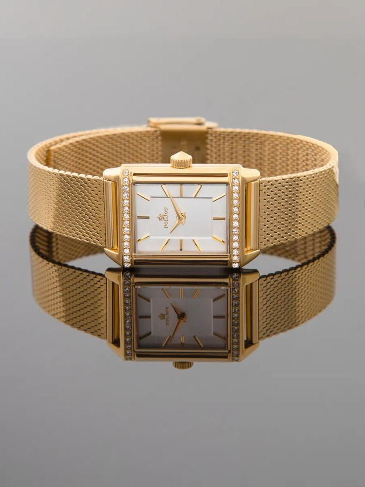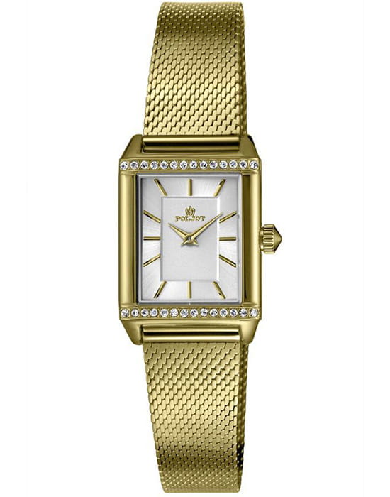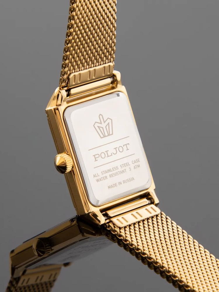 Poljot VX50.1846322 — утончённые женские кварцевые часы, вдохновлённые эстетикой ретро-гламура и современной сдержанностью. Прямоугольный корпус из нержавеющей стали с PVD-покрытиемPVDУльтратонкое покрытие наносится в технике вакуумного напыления, сочетает в себе нитрид титана особой прочности со слоем золота или оксида хрома. Несёт в себе декоративную или защитную функцию. аккуратной инкрустацией придаёт модели изысканный блеск, а нежный циферблат создаёт мягкий контраст и ощущение воздушности. Минималистичные стрелки и метки подчёркивают лаконичность дизайна, сохраняя при этом утончённую женственность. Точный японский механизм гарантирует надёжную работу, а прочное минеральное стеклоМинеральное стеклоМинеральное стекло представляет собой искусственно выращенный минерал кварца. Такое стекло отличается особой устойчивостью к повреждениям и царапинам. Уступает по некоторым качествам сапфировому стеклу. защищает поверхность от повреждений. Металлический миланский браслет с PVD-покрытиемPVDУльтратонкое покрытие наносится в технике вакуумного напыления, сочетает в себе нитрид титана особой прочности со слоем золота или оксида хрома. Несёт в себе декоративную или защитную функцию. на раскладном замкеРаскладной замокДанный вариант застежки используется только на часах с металлическим браслетом. Отличительная особенность такого крепления в том, что длина браслета становится универсальной и вы можете самостоятельно отрегулировать нужный вам размер – застежка просто двигается по браслету часов. комфортно облегает запястье, добавляя образу лёгкости и элегантного сияния. Poljot — это украшение и аксессуар в одном, идеальный выбор для женщины, ценящей благородный стиль и безупречное чувство вкуса.