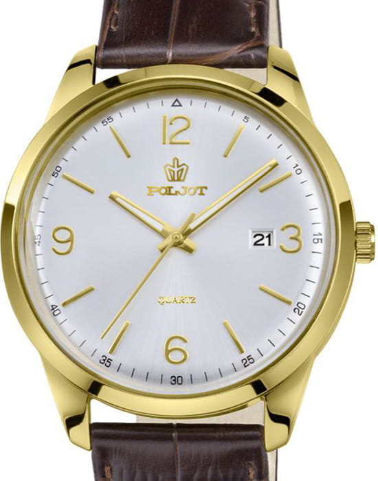 Poljot 2315.586200 — элегантные кварцевые мужские часы, объединяющие лаконичный дизайн и повседневную универсальность. Корпус из нержавеющей стали с PVD-покрытиемPVDУльтратонкое покрытие наносится в технике вакуумного напыления, сочетает в себе нитрид титана особой прочности со слоем золота или оксида хрома. Несёт в себе декоративную или защитную функцию. подчёркивает строгость линий и сдержанную эстетику, а глубокий циферблат с аккуратным гильоше и арабскими цифрами создаёт гармоничное визуальное равновесие. Тонкие золотистые стрелки с люминесцентным покрытиемЛюминесцентное покрытиеПозволяет считывать показания времени в темноте. Производители наносят на стрелки, часовые индексы, безель или поверхность циферблата светонакопительный состав, дающий холодное свечение. обеспечивают лёгкость восприятия времени, а окно даты на позиции «3 часа» добавляет практичности. Прочное минеральное стеклоМинеральное стеклоМинеральное стекло представляет собой искусственно выращенный минерал кварца. Такое стекло отличается особой устойчивостью к повреждениям и царапинам. Уступает по некоторым качествам сапфировому стеклу. защищает циферблат от мелких повреждений, а ремешок из натуральной кожи с фактурой крокодила обеспечивает комфорт и элегантное прилегание к запястью. Poljot — это часы для мужчин, ценящих точность, простоту и утончённый повседневный стиль.