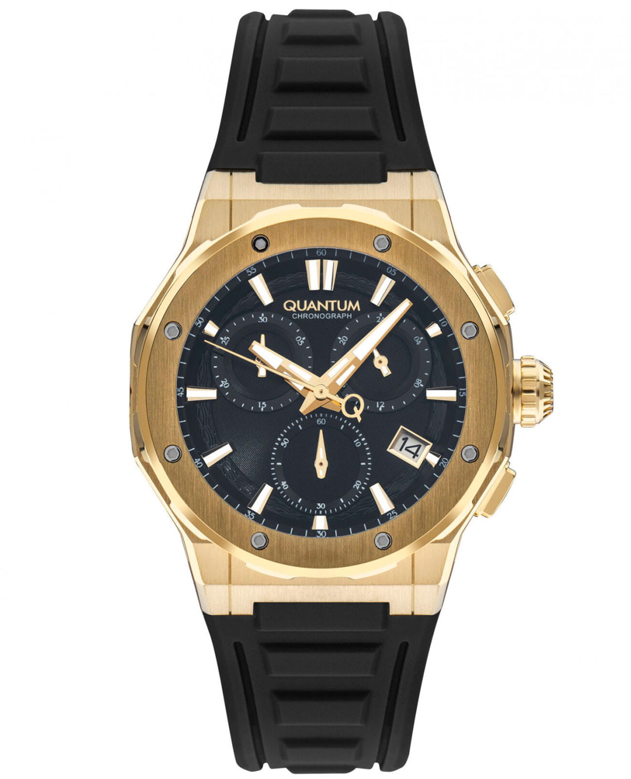Мужские кварцевые часы Quantum HNG1082.251 из коллекции Hunter — круглый корпус размером 46 мм из нержавеющей стали с PVD-покрытиемPVDУльтратонкое покрытие наносится в технике вакуумного напыления, сочетает в себе нитрид титана особой прочности со слоем золота или оксида хрома. Несёт в себе декоративную или защитную функцию., оснащённый функциями хронографаХронографФункция позволяет измерять отрезки времени с особой точностью: часы, минуты, секунды. Верным признаком хронографа является наличие на циферблате 3 дополнительных окошек-счётчиков., секундомера и окошком даты. Стекло — минеральноеМинеральное стеклоМинеральное стекло представляет собой искусственно выращенный минерал кварца. Такое стекло отличается особой устойчивостью к повреждениям и царапинам. Уступает по некоторым качествам сапфировому стеклу. с антибликовым покрытием. Механизм — кварцевый. Водонепроницаемость 100 м. Задняя крышка завинчивающаяся. Ремешок чёрный силиконовый на стандартной застёжке. Идеальный выбор для тех, кто ценит турецкий дизайн и функциональный спортивный стиль.
