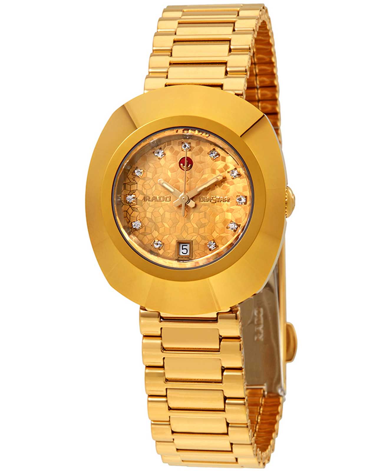 Женские механические швейцарские часы с автоподзаводом Rado The Original R12416643, кварцевый механизм с высокой точностью. Сапфировое стеклоСапфировое стеклоПрочный и надёжный материал из кристалла сапфира синтетического происхождения, характеризующийся особой твёрдостью и устойчивостью к царапинам и повреждениям. устойчивое к появлению царапин, обладающее высокой прозрачностью. Корпус и браслет часов выполнены из нержавеющей стали c PVD-покрытиемPVDУльтратонкое покрытие наносится в технике вакуумного напыления, сочетает в себе нитрид титана особой прочности со слоем золота или оксида хрома. Несёт в себе декоративную или защитную функцию.. Циферблат инкрустирован кристаллами. Класс водозащиты: 30 метров, позволит защитить корпус от случайных брызг или капель дождя. Браслет на раскладной застёжкеРаскладная застёжкаТакой тип застёжки используется только на браслетах из металла. Она никогда не раскрывается полностью, происходит разделение на 2 и более частей. Раскладывающая застёжка снизит вероятность потери часов к минимуму..