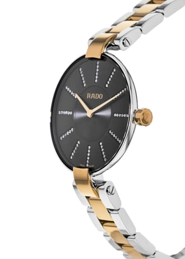 Швейцарские женские часы Rado Coupole R22850713, кварцевый механизм с высокой точностью. Сапфировое стеклоСапфировое стеклоПрочный и надёжный материал из кристалла сапфира синтетического происхождения, характеризующийся особой твёрдостью и устойчивостью к царапинам и повреждениям. устойчивое к появлению царапин, обладающее высокой прозрачностью. Корпус часов изготовлен из нержавеющей стали. Класс водозащиты: 50 метров, позволит защитить корпус от случайных брызг или капель дождя. Стальной браслет с частичным  PVD-покрытиемPVDУльтратонкое покрытие наносится в технике вакуумного напыления, сочетает в себе нитрид титана особой прочности со слоем золота или оксида хрома. Несёт в себе декоративную или защитную функцию. на раскладной застёжкеРаскладная застёжкаТакой тип застёжки используется только на браслетах из металла. Она никогда не раскрывается полностью, происходит разделение на 2 и более частей. Раскладывающая застёжка снизит вероятность потери часов к минимуму.. Циферблат декорирован бриллиантами.