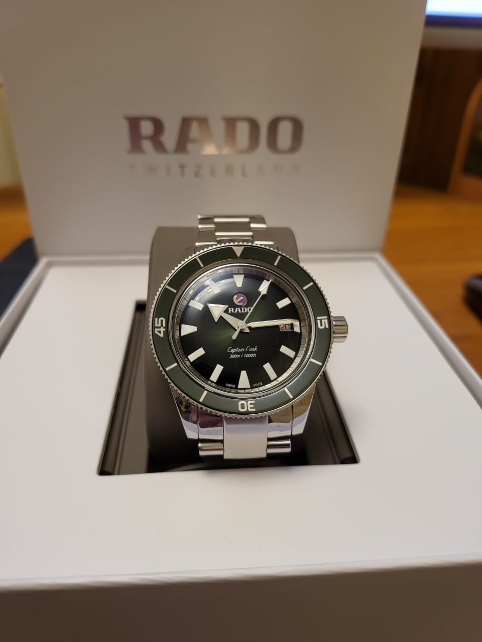 Премиальная модель обладает винтажным характером, зелёный циферблат обращает наше внимание на оригинальные стрелки в виде меча и стрелы. Часы обладают высокими показателями водонепроницаемости - сохранение герметичности до 30 бар, что стало возможным благодаря задней крышке и заводной головке с винтовыми фиксаторами. Автоподзавод. Швейцарский калибр ETA C07.611 с 80-часовым резервом хода. Антибликовая обработка сапфирового стекла. Корпус из хирургической стали 316L, безельБезельВнешний ободок, закрепляющий стекло. В спортивных часах так называется поворотное кольцо с делениями на циферблате, выполняет роль таймера – замеряет отрезки времени на шкале. Неподвижный безель – элемент декора. Однонаправленно вращающийся безель на дайверских часах позволяет фиксировать моменты погружения и выныривания на поверхность. из высокотехнологичной керамикиВысокотехнологичная керамикаИнновационный запатентованный Rado материал с гладкой или матовой поверхностью. Керамика за счёт кристаллической структуры обладает повышенной устойчивостью от возникновения царапин. Материал способен принимать температуру тела человека, обеспечивая невероятный комфорт при ношении.. Прочный стальной браслет. Отображение числа. Диаметр корпуса: 42 мм.
