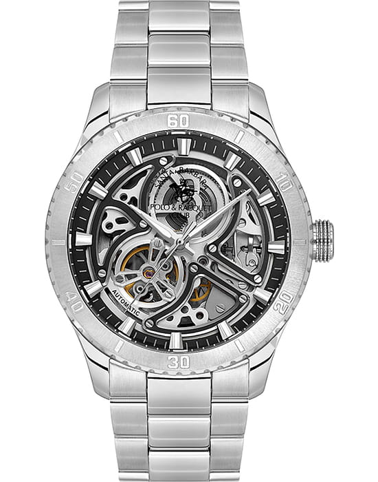 Мужские механические часы с автоподзаводом Santa Barbara Polo & Racquet Club Luxury — это стильный и функциональный аксессуар для современного джентльмена. Изысканный корпус из стали 316L  диаметром 42.5 мм. Изящный скелетонизированный циферблат украшен фирменным логотипом, с метками. Накладные лаконичные метки и стрелки с люминесцентным покрытиемЛюминесцентное покрытиеПозволяет считывать показания времени в темноте. Производители наносят на стрелки, часовые индексы, безель или поверхность циферблата светонакопительный состав, дающий холодное свечение., обеспечивающим хорошую читаемость в темноте. Циферблат защищён минеральным стекломМинеральное стеклоМинеральное стекло представляет собой искусственно выращенный минерал кварца. Такое стекло отличается особой устойчивостью к повреждениям и царапинам. Уступает по некоторым качествам сапфировому стеклу., устойчивым к царапинам и механическим повреждениям. Стальной браслет на застёжке-бабочке с кнопкамиЗастёжка "бабочка"Такой вид застёжки дополняется предохранителями, помогающими избежать случайного раскрытия браслета. Обладают изящным исполнением. обеспечивает комфортное и безопасное ношение. Водонепроницаемость 50 м позволяет использовать часы в повседневных условиях. Идеальный выбор для тех, кто ценит элегантность, точность и надёжность.