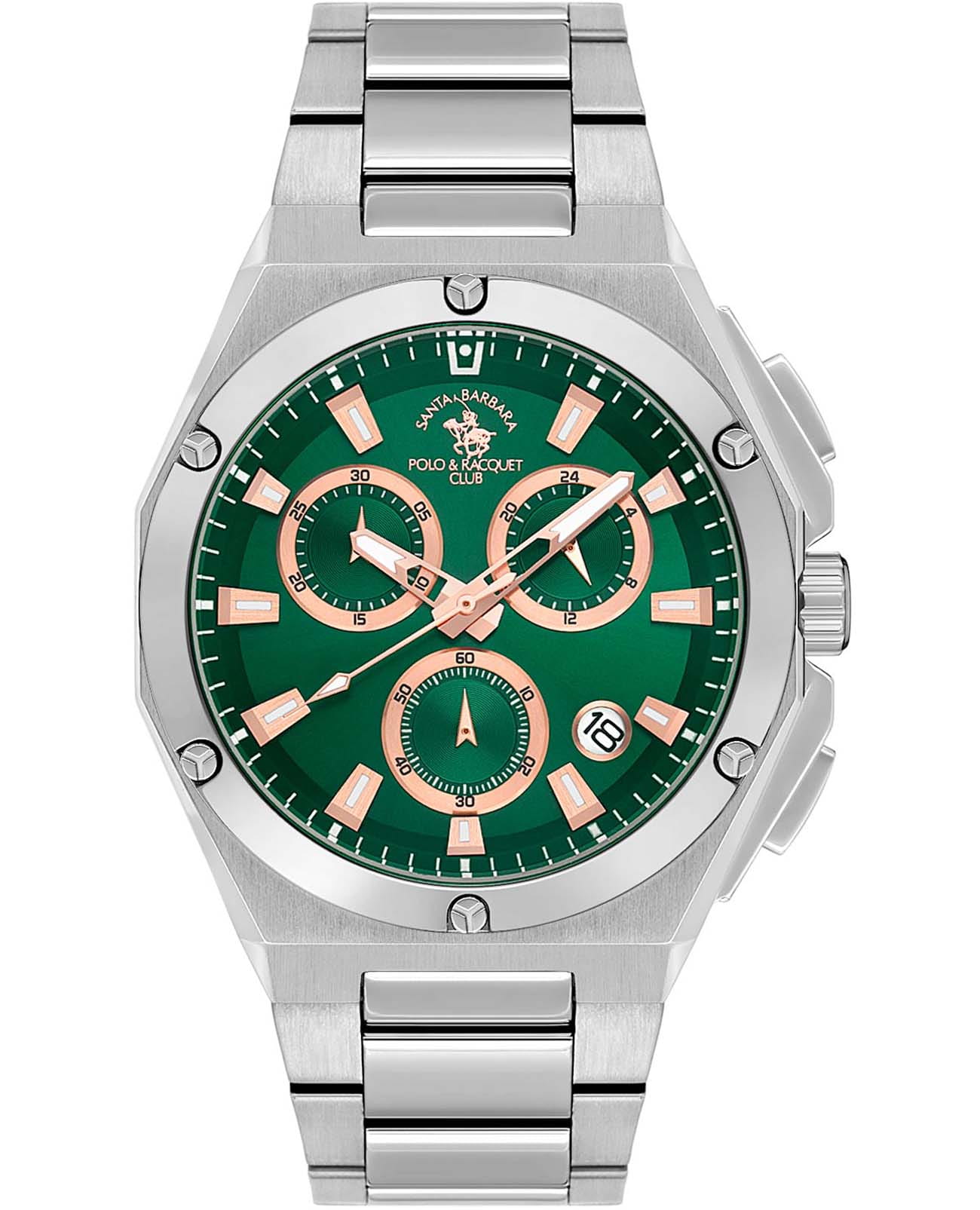 Santa Barbara Polo & Racquet Club Prive SB.1.10577-3 — стильные мужские часы-хронограф, сочетающие спортивную динамику и функциональность. Крупный корпус выполнен из нержавеющей стали 316L и гармонично дополнен браслетом на  раскладной застёжкеРаскладная застёжкаТакой тип застёжки используется только на браслетах из металла. Она никогда не раскрывается полностью, происходит разделение на 2 и более частей. Раскладывающая застёжка снизит вероятность потери часов к минимуму.. Циферблат с акцентными метками и стрелками с люминесцентным покрытиемЛюминесцентное покрытиеПозволяет считывать показания времени в темноте. Производители наносят на стрелки, часовые индексы, безель или поверхность циферблата светонакопительный состав, дающий холодное свечение. оформлен в многослойной структуре и оснащён вспомогательными индикаторами, включая хронографХронографФункция позволяет измерять отрезки времени с особой точностью: часы, минуты, секунды. Верным признаком хронографа является наличие на циферблате 3 дополнительных окошек-счётчиков., 24-часовой формат времени. В нижней части расположено окошко даты, что делает модель ещё более практичной. Минеральное стеклоМинеральное стеклоМинеральное стекло представляет собой искусственно выращенный минерал кварца. Такое стекло отличается особой устойчивостью к повреждениям и царапинам. Уступает по некоторым качествам сапфировому стеклу. защищает циферблат от царапин, а кварцевый механизм обеспечивает высокую точность. Водонепроницаемость 50 метров позволит защитить корпус от случайных брызг или капель дождя. Благодаря своей универсальной эстетике эти часы уместны и в деловой среде, и в повседневном образе.