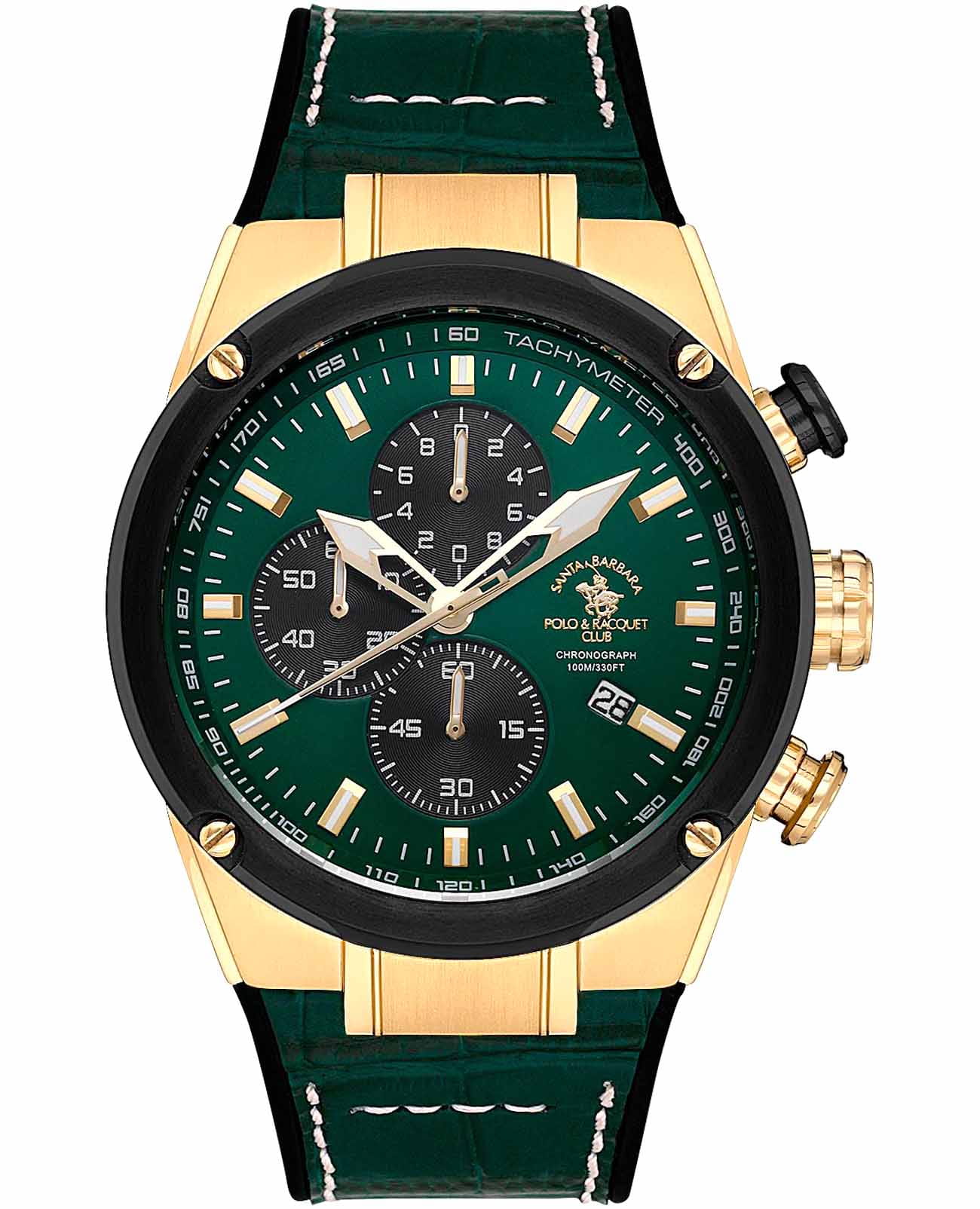 Мужские кварцевые часы-хронографХронографФункция позволяет измерять отрезки времени с особой точностью: часы, минуты, секунды. Верным признаком хронографа является наличие на циферблате 3 дополнительных окошек-счётчиков. с секундомеромСекундомерСекундоме́р — прибор, способный измерять интервалы времени с точностью до долей секунды. Santa Barbara Polo & Racquet Club SB.3.10001-5 — воплощение элегантности и технического совершенства. Корпус из нержавеющей стали с IP-покрытиемIP-покрытиеМетод ионного напыления. Демонстрирует повышенную устойчивость к истиранию, окислению и химическим веществам. Под воздействием высокого давления и температуры около 1500°C молекулы металла надёжно соединяются с частицами корпуса часов. золотистого цвета, диаметром 45 мм, что делает их устойчивыми к внешним воздействиям и придает благородный вид. Стрелки и метки с люминесцентным покрытиемЛюминесцентное покрытиеПозволяет считывать показания времени в темноте. Производители наносят на стрелки, часовые индексы, безель или поверхность циферблата светонакопительный состав, дающий холодное свечение., обеспечивающим хорошую читаемость в темноте. Неподвижный безельБезельВнешний ободок, закрепляющий стекло. В спортивных часах так называется поворотное кольцо с делениями на циферблате, выполняет роль таймера – замеряет отрезки времени на шкале. Неподвижный безель – элемент декора. Однонаправленно вращающийся безель на дайверских часах позволяет фиксировать моменты погружения и выныривания на поверхность. с IP-покрытиемIP-покрытиеМетод ионного напыления. Демонстрирует повышенную устойчивость к истиранию, окислению и химическим веществам. Под воздействием высокого давления и температуры около 1500°C молекулы металла надёжно соединяются с частицами корпуса часов. черного цвета. Циферблат защищён минеральным стекломМинеральное стеклоМинеральное стекло представляет собой искусственно выращенный минерал кварца. Такое стекло отличается особой устойчивостью к повреждениям и царапинам. Уступает по некоторым качествам сапфировому стеклу. устойчивое к царапинам и механическим повреждениям. Окошко даты находится в положении 4 часа, тахиметрТахиметрРазмеченная шкала, располагается на ободке или безеле часов. Тахиметр позволяет рассчитать скорость на определённом участке пути, расстояние измеряется в километрах или милях. по внешнему краю. Кожаный ремешок на стандартной застёжке обеспечивает комфортное и безопасное ношение. Водонепроницаемость 100 метров позволит плавать, нырять и заниматься другими водными видами спорта. Идеальный выбор для тех, кто ценит элегантный дизайн и качество.