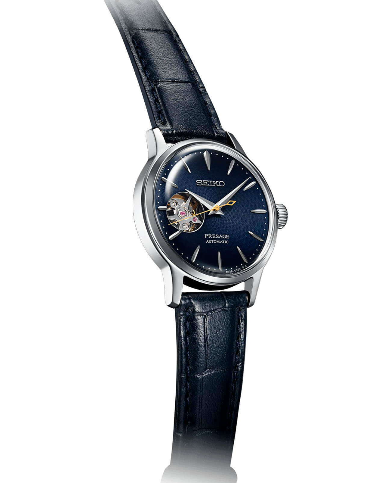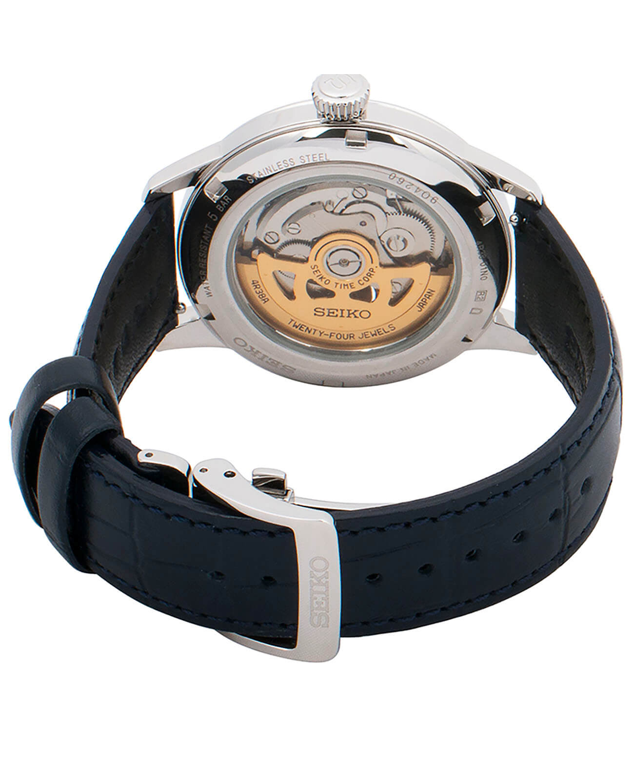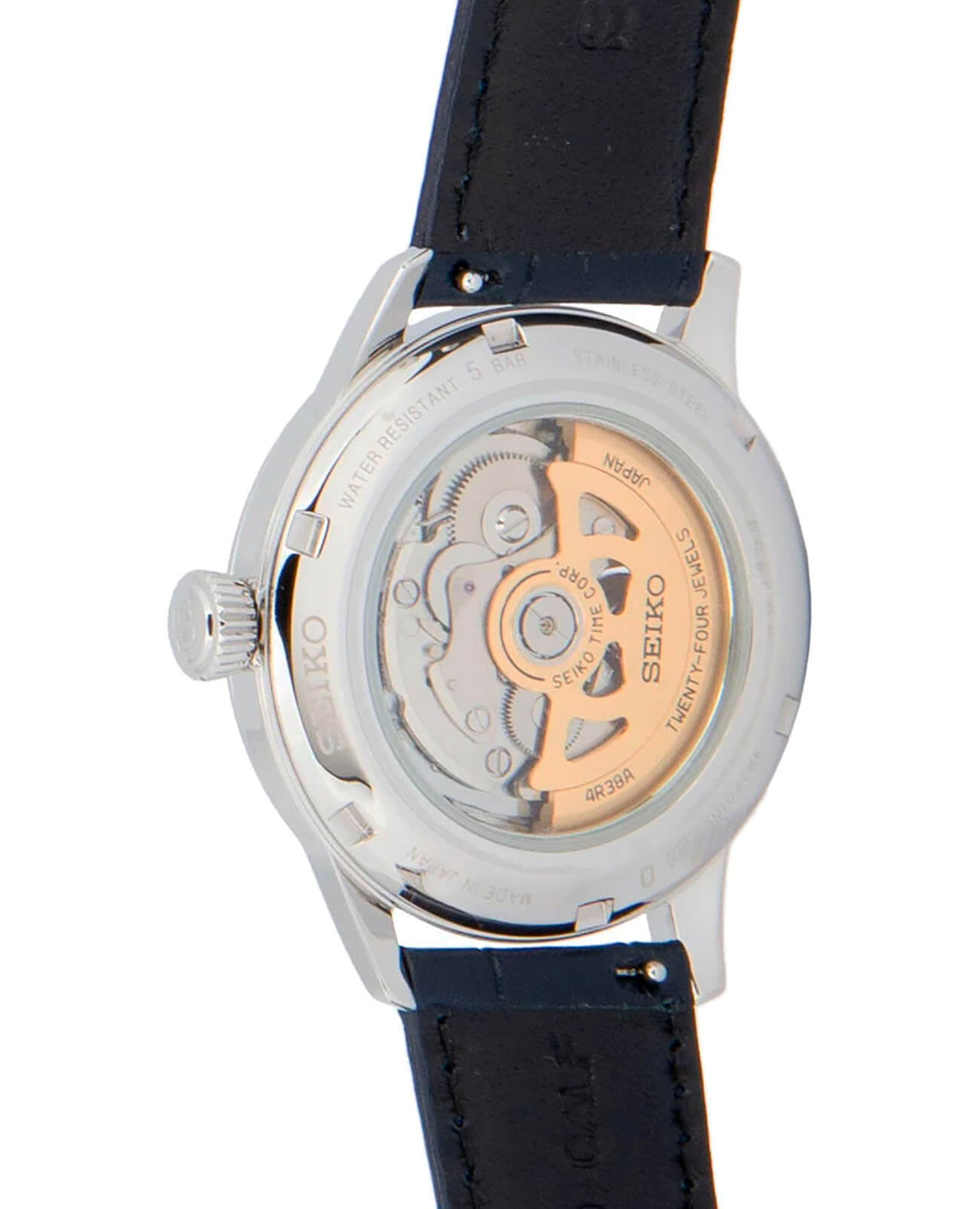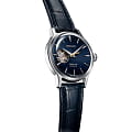 Синий циферблат привлекает лаконичным узором, крупная индикация времени обеспечивает идеальную читаемость данных. На позиции 9 часов размещено круглое окошко, позволяющее прикоснуться к миру часового искусства. Это часы с автоподзаводом, работа японского автоматического механизма Seiko 4R38 просматривается сквозь завинчивающуюся прозрачную заднюю крышку. Запас хода – 40 часов, функция «stop-second» позволяет остановить часовой механизм для настройки времени с точностью до секунды. Ремешок выполнен из натуральной кожи. Циферблат защищён ультрапрочным минеральным стеклом Hardlex. Диаметр корпуса: 40,5 мм.