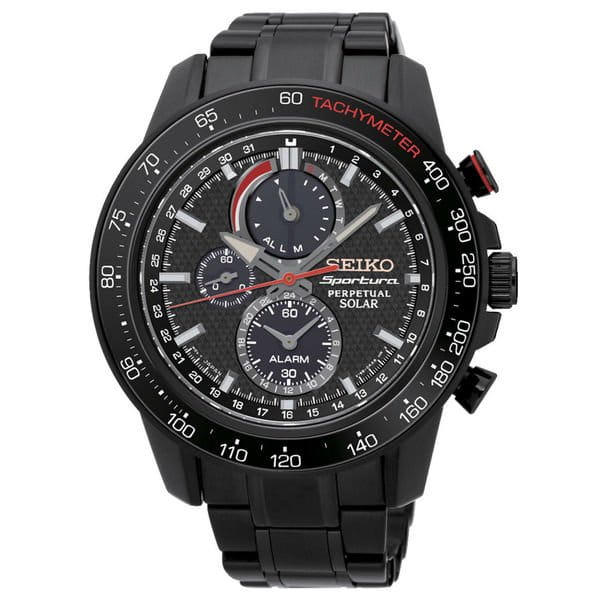 Эффектные мужские часы в современным дизайном. Механизм работает от солнечной энергии, калибр Seiko V198. Корпус круглой формы, с черным аналоговый циферблатом, и браслет выполнены из нержавеющей стали с PVD покрытием. Сапфировое стекло устойчиво к царапинам. Оснащены функциями хронографа, вечного календаря и будильника. Водонепроницаемость 100 м.