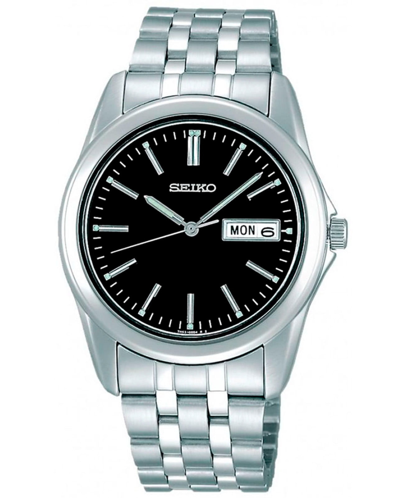 Мужские кварцевые часы Seiko — это элегантный аксессуар в классическом стиле. Корпус размером 38 мм и толщиной 8 мм выполнен из нержавеющей стали. Циферблат чёрного цвета оформлен индексами и стрелками. Указатели дня недели и даты вынесены на отдельные субциферблаты. Стрелки и метки с люминесцентным покрытиемЛюминесцентное покрытиеПозволяет считывать показания времени в темноте. Производители наносят на стрелки, часовые индексы, безель или поверхность циферблата светонакопительный состав, дающий холодное свечение., обеспечивающим хорошую читаемость в темноте. Циферблат защищён прочным защищён минеральным стекломМинеральное стеклоМинеральное стекло представляет собой искусственно выращенный минерал кварца. Такое стекло отличается особой устойчивостью к повреждениям и царапинам. Уступает по некоторым качествам сапфировому стеклу. от компании Seiko. Часы оснащены стальным браслетом с раскладной застёжкойРаскладная застёжкаТакой тип застёжки используется только на браслетах из металла. Она никогда не раскрывается полностью, происходит разделение на 2 и более частей. Раскладывающая застёжка снизит вероятность потери часов к минимуму.. Водонепроницаемость 30 м позволяет использовать часы в повседневных условиях. Идеальный выбор для тех, кто ценит японское качество и лаконичный дизайн.