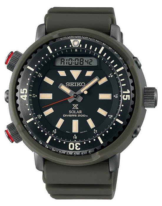 Японские мужские часы Seiko SNJ031P1 из коллекции Prospex стали перевоплощением легендарного хронографаХронографФункция позволяет измерять отрезки времени с особой точностью: часы, минуты, секунды. Верным признаком хронографа является наличие на циферблате 3 дополнительных окошек-счётчиков. 80-х годов, который предпочитал носить актёр Арнольд Шварценеггер. Наручные часы отражают брутальный, спортивный характер. Внешний облик позаимствован у предшественника Seiko H558-5009, выполненный в дайверском стиле. Аксессуар работает за счёт японского кварцевого калибра Seiko H851, получающего энергию за счёт источников света – реализация технологии . При полностью заряженном элементе питания модель проработает 6 месяцев без необходимости подзарядки. Противоударный корпусУдаропрочный корпусМеханизм заключён в корпус, выполненный из современных материалов, устойчивых к ударам, механическим повреждениям и падению с высоты: инновационный пластик, карбон, нержавеющая сталь, титан. имеет двойную конструкцию, где нержавеющая сталь 316L дополнительно защищена полимерными протекторами. Циферблат оснащён минеральным закаленным стеклом Hardlex, прочным и устойчивым к царапинам. Сохраняется водостойкость до 200 метров в соответствии со стандартом ISO 6425. Дисплей подсвечивается светодиодомСветодиодная подсветкаСветодиодная или LED-подсветка обеспечивает появление яркого холодного свечения за счёт LED-элементов - маленьких лампочек. Они потребляют минимальное количество энергии, чаще всего можно встретить 1 светодиод, в нижней части циферблата., стрелки и индексы имеют люминесцентную подсветкуЛюминесцентное покрытиеПозволяет считывать показания времени в темноте. Производители наносят на стрелки, часовые индексы, безель или поверхность циферблата светонакопительный состав, дающий холодное свечение.. Функции: будильник, секундомер, вечный календарьВечный календарьКлассическое часовое усложнение, представляющее собой календарь, рассчитанный на несколько лет вперёд (стандартно – до 2099 года). Определяет текущую дату, день недели, месяц.. Диаметр корпуса: 47,8 мм.