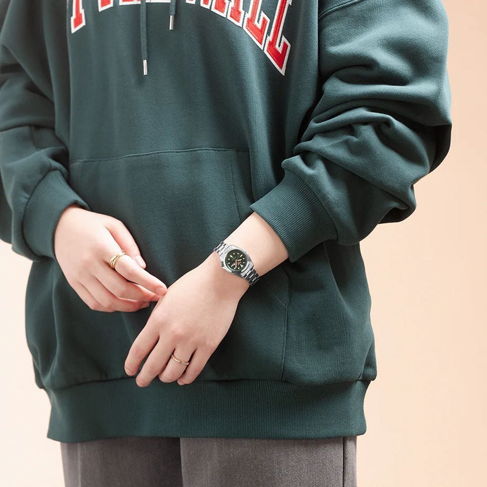 Модель Seiko SRRA005 из коллекции Seiko 5 Sports — это компактные автоматические часы с женственным характером и надёжной механикой. Корпус диаметром 28 мм выполнен из нержавеющей стали и оснащён завинчивающейся задней крышкой. Водозащита составляет 100 метров, что делает модель подходящей для повседневного использования, включая активные занятия. Фиксированный стальной безельБезельВнешний ободок, закрепляющий стекло. В спортивных часах так называется поворотное кольцо с делениями на циферблате, выполняет роль таймера – замеряет отрезки времени на шкале. Неподвижный безель – элемент декора. Однонаправленно вращающийся безель на дайверских часах позволяет фиксировать моменты погружения и выныривания на поверхность. подчёркивает аккуратный силуэт корпуса. Циферблат украшен крупными метками и стрелками, покрытыми люминесцентным покрытиемЛюминесцентное покрытиеПозволяет считывать показания времени в темноте. Производители наносят на стрелки, часовые индексы, безель или поверхность циферблата светонакопительный состав, дающий холодное свечение. LumiBrite, обеспечивая отличную читаемость даже в условиях слабой освещённости. На 3 часах расположен двойной указатель даты и дня недели. Циферблат защищён прочным стеклом Hardlex, устойчивым к царапинам. Внутри установлен автоматический механизм Seiko 2R06 с функцией ручного подзавода, остановкой секундной стрелки и запасом хода до 40 часов. Браслет из нержавеющей стали с шириной 14 мм дополнен удобной раскладной застёжкойРаскладная застёжкаТакой тип застёжки используется только на браслетах из металла. Она никогда не раскрывается полностью, происходит разделение на 2 и более частей. Раскладывающая застёжка снизит вероятность потери часов к минимуму. с кнопкой. Seiko — это гармония изящного дизайна и технологичной надёжности, компактный и стильный выбор для повседневной женской классики.