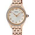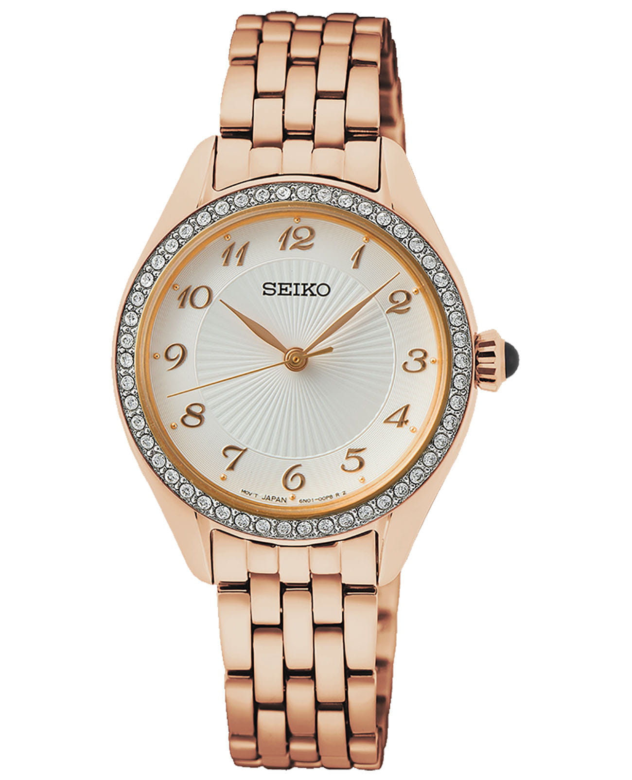 Женские японские часы Seiko Prospex SUR396P1, кварцевый механизм с высокой точностью. Класс водозащиты: 50 метров, позволит защитить корпус от случайных брызг или капель дождя. Корпус часов изготовлен из стали, позолоченного цвета.