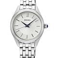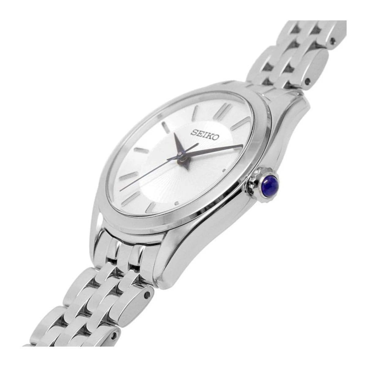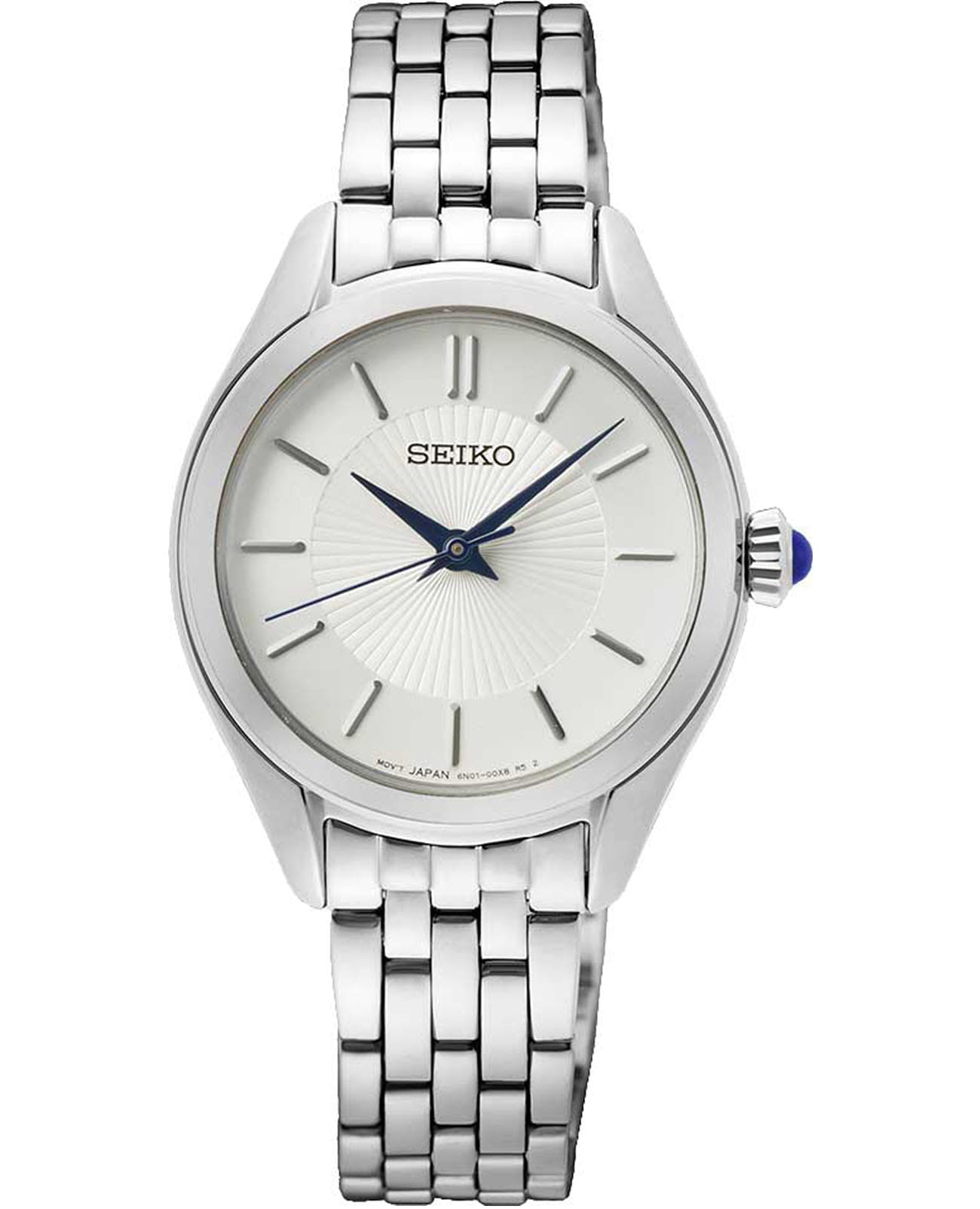 Женские японские часы Seiko CS Dress SUR537P1 c кварцевым механизмом с высокой точностью. Минеральное стеклоМинеральное стеклоМинеральное стекло представляет собой искусственно выращенный минерал кварца. Такое стекло отличается особой устойчивостью к повреждениям и царапинам. Уступает по некоторым качествам сапфировому стеклу., устойчивое к появлению царапин, обладающее высокой прозрачностью. Класс водозащиты: 50 метров, позволит плавать, нырять и заниматься другими водными видами спорта. Корпус и браслет часов изготовлен из стали. Белый циферблат с метками в виде штрихов. Браслет с тройной раскладной застёжкойРаскладная застёжкаТакой тип застёжки используется только на браслетах из металла. Она никогда не раскрывается полностью, происходит разделение на 2 и более частей. Раскладывающая застёжка снизит вероятность потери часов к минимуму.. Часы Seiko CS Dress SUR537P1 — выбор для тех, кто ценит чистую эстетику, точность и строгость, обрамлённые в современный и лаконичный дизайн.