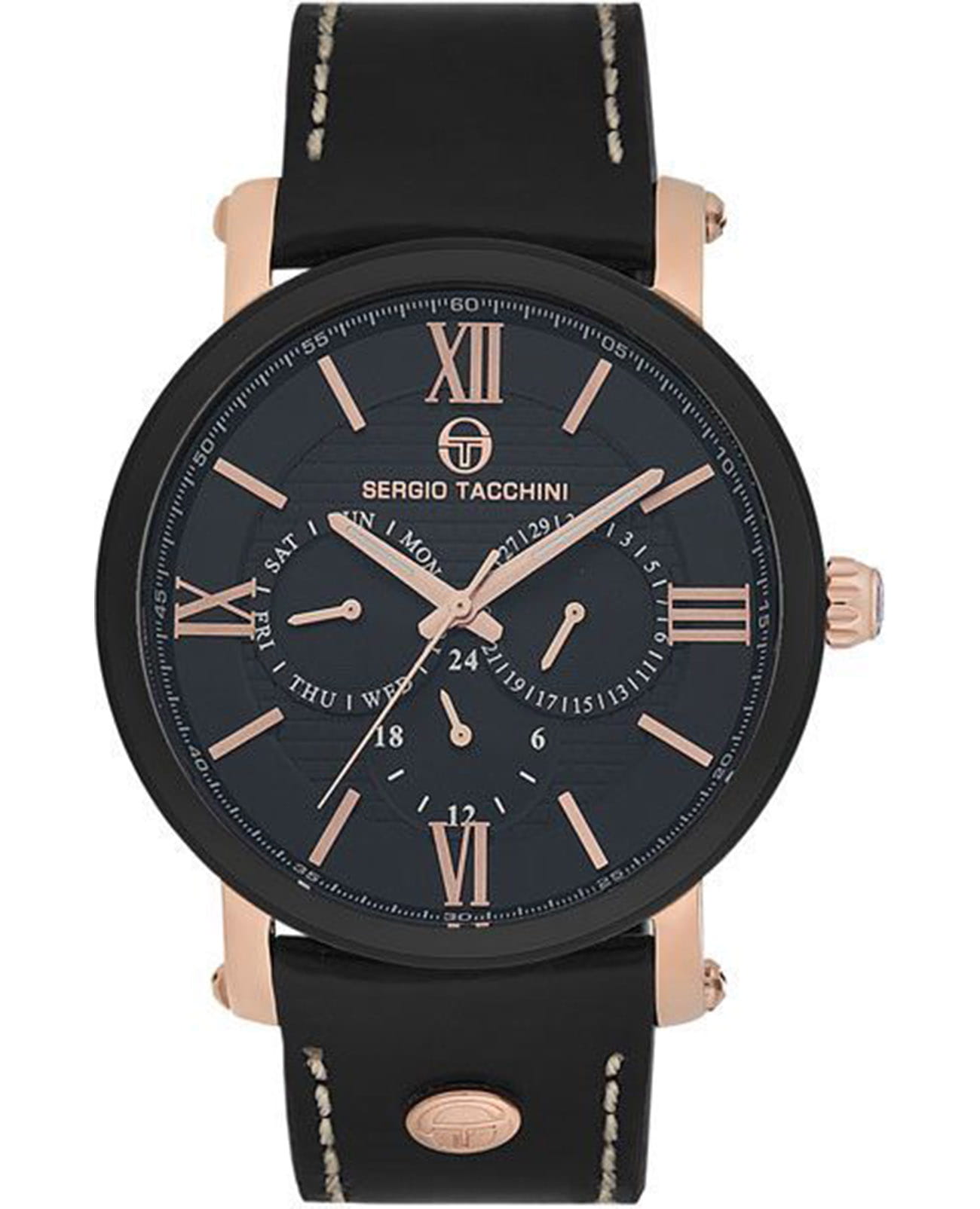 Мужские кварцевые часы Sergio Tacchini из коллекции City — это стильный аксессуар с классическими чертами для уверенного покорения городской жизни. Корпус диаметром 46 мм выполнен из нержавеющей стали 316L с PVD-покрытиемPVDУльтратонкое покрытие наносится в технике вакуумного напыления, сочетает в себе нитрид титана особой прочности со слоем золота или оксида хрома. Несёт в себе декоративную или защитную функцию.. Циферблат чёрного цвета оформлен индексами и стрелками. Указатели дня недели и даты вынесены на отдельные субциферблаты, также присутствует индикация 24-часового формата времени. Стрелки с люминесцентным покрытиемЛюминесцентное покрытиеПозволяет считывать показания времени в темноте. Производители наносят на стрелки, часовые индексы, безель или поверхность циферблата светонакопительный состав, дающий холодное свечение., обеспечивающим хорошую читаемость в темноте. Циферблат защищён минеральным стекломМинеральное стеклоМинеральное стекло представляет собой искусственно выращенный минерал кварца. Такое стекло отличается особой устойчивостью к повреждениям и царапинам. Уступает по некоторым качествам сапфировому стеклу. с антибликовым покрытиемАнтибликовое покрытиеСлой оксида металла в 0,13-0,3 микрон, благодаря которому стекло часов не бликует и не отражает свет. Антибликовое покрытие уменьшает отражение света в 10 раз, обеспечивая отличную читаемость показателей циферблата.. Механизм — японский кварцевый калибр Miyota 6P29. Часы оснащены кожаным ремешком чёрного цвета с стандартной застёжкой. Водонепроницаемость 100 м позволяет использовать часы в повседневных условиях. Идеальный выбор для тех, кто ценит функциональность и элегантный дизайн.
