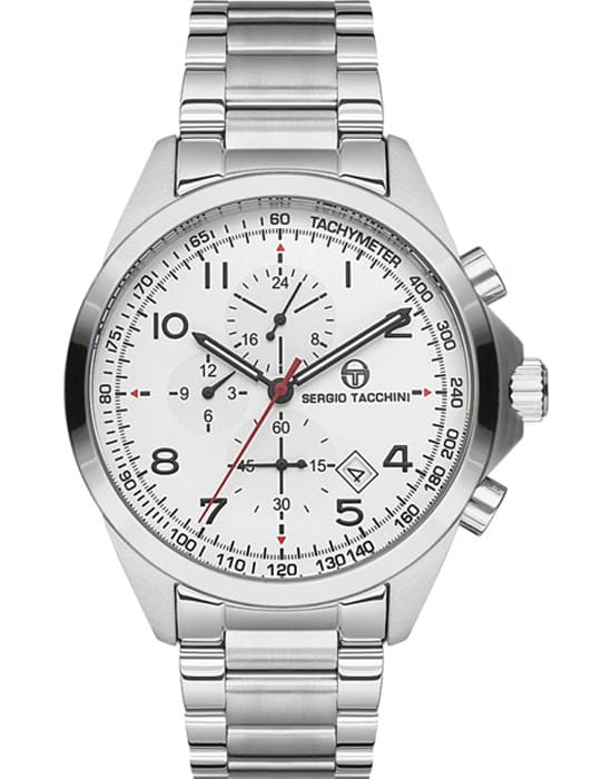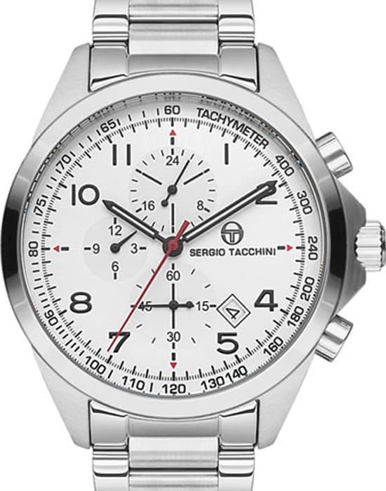 Sergio Tacchini ST.8.115.06 — стильные мужские часы с узнаваемым спортивным характером и выразительным белым циферблатом с тремя счётчиками хронографаХронографФункция позволяет измерять отрезки времени с особой точностью: часы, минуты, секунды. Верным признаком хронографа является наличие на циферблате 3 дополнительных окошек-счётчиков.. Корпус и браслет выполнены из нержавеющей стали с аккуратно отполированными звеньями, а застёжка типа «бабочка»Застёжка "бабочка"Такой вид застёжки дополняется предохранителями, помогающими избежать случайного раскрытия браслета. Обладают изящным исполнением. обеспечивает надёжную фиксацию на запястье и комфорт при носке. Минутная шкала с тахиметрической разметкой по ободу подчёркивает динамичный характер модели, а стрелки и метки покрыты люминесцентным покрытиемЛюминесцентное покрытиеПозволяет считывать показания времени в темноте. Производители наносят на стрелки, часовые индексы, безель или поверхность циферблата светонакопительный состав, дающий холодное свечение. для удобства считывания показаний в темноте. Стекло минеральноеМинеральное стеклоМинеральное стекло представляет собой искусственно выращенный минерал кварца. Такое стекло отличается особой устойчивостью к повреждениям и царапинам. Уступает по некоторым качествам сапфировому стеклу., устойчивое к мелким царапинам, защищает циферблат от повреждений. Гармоничное сочетание спортивной функциональности и элегантного итальянского дизайна делает эту модель практичным и выразительным аксессуаром для повседневного стиля.