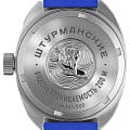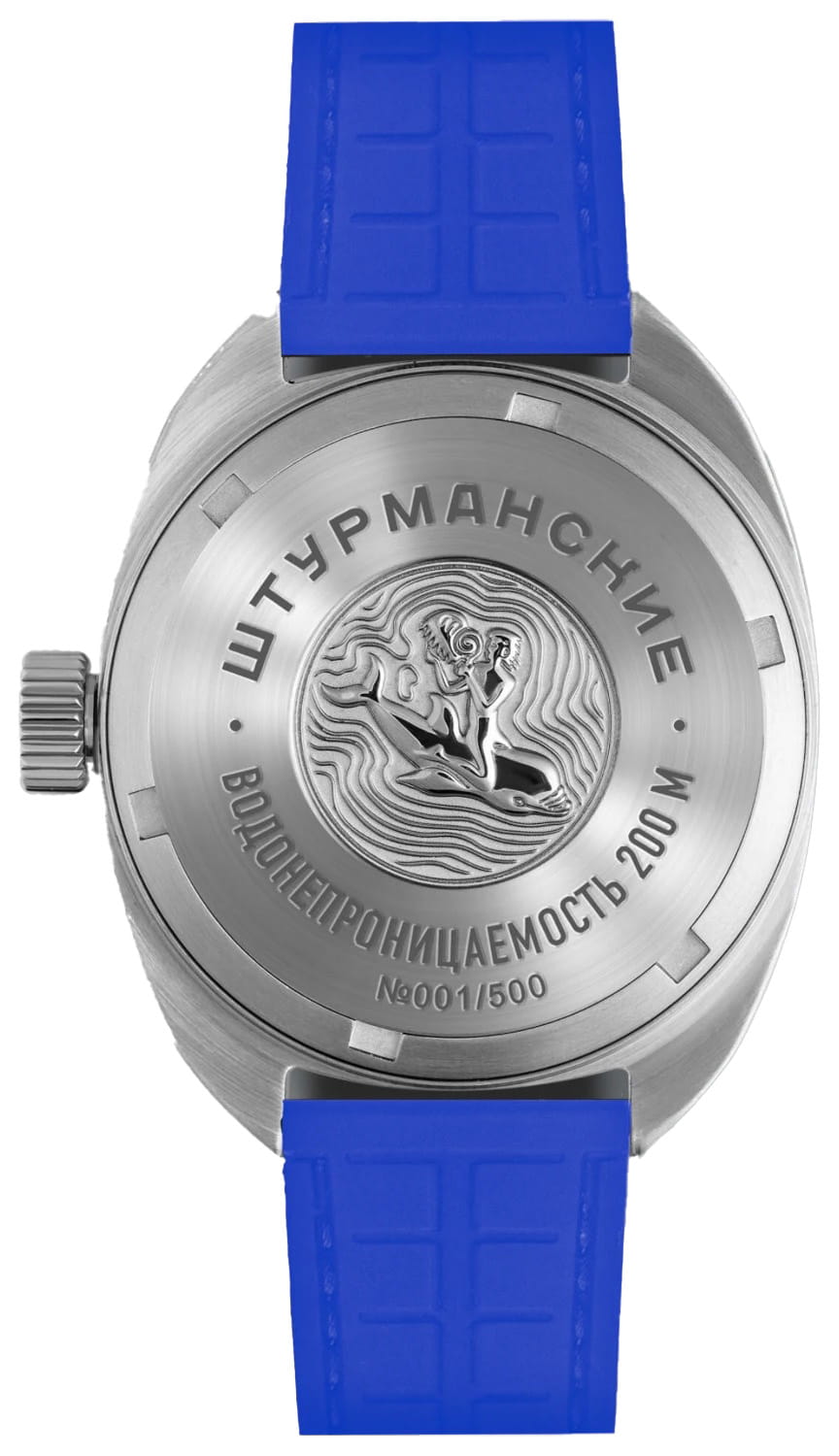Штурманские мужские российские механические часы с утолщённым сферическим минеральным стекломМинеральное стеклоМинеральное стекло представляет собой искусственно выращенный минерал кварца. Такое стекло отличается особой устойчивостью к повреждениям и царапинам. Уступает по некоторым качествам сапфировому стеклу. Штурманские Амфибия 2416/7771303, механический механизм (автоматический калибр) с высокой точностью. Класс водозащиты: 200 метров, позволит плавать, нырять и заниматься другими водными видами спорта. Корпус часов изготовлен из стали. Силиконовый ремешок на стандартной застёжке. БезельБезельВнешний ободок, закрепляющий стекло. В спортивных часах так называется поворотное кольцо с делениями на циферблате, выполняет роль таймера – замеряет отрезки времени на шкале. Неподвижный безель – элемент декора. Однонаправленно вращающийся безель на дайверских часах позволяет фиксировать моменты погружения и выныривания на поверхность. с PVD-покрытиемPVDУльтратонкое покрытие наносится в технике вакуумного напыления, сочетает в себе нитрид титана особой прочности со слоем золота или оксида хрома. Несёт в себе декоративную или защитную функцию.. Стрелки и метки с люминесцентным покрытиемЛюминесцентное покрытиеПозволяет считывать показания времени в темноте. Производители наносят на стрелки, часовые индексы, безель или поверхность циферблата светонакопительный состав, дающий холодное свечение.. Окошко даты находится в положении 3 часа. Амфибия созданы на основе российского механического калибра с автоматическим подзаводом, 2416.  На задней крышке – как дань исторической модели – рельефные изображения всадника на дельфине.