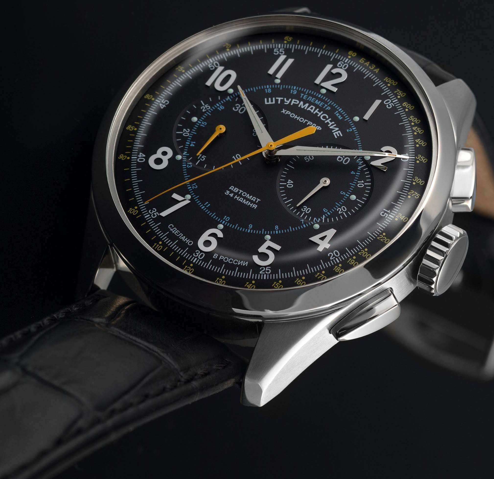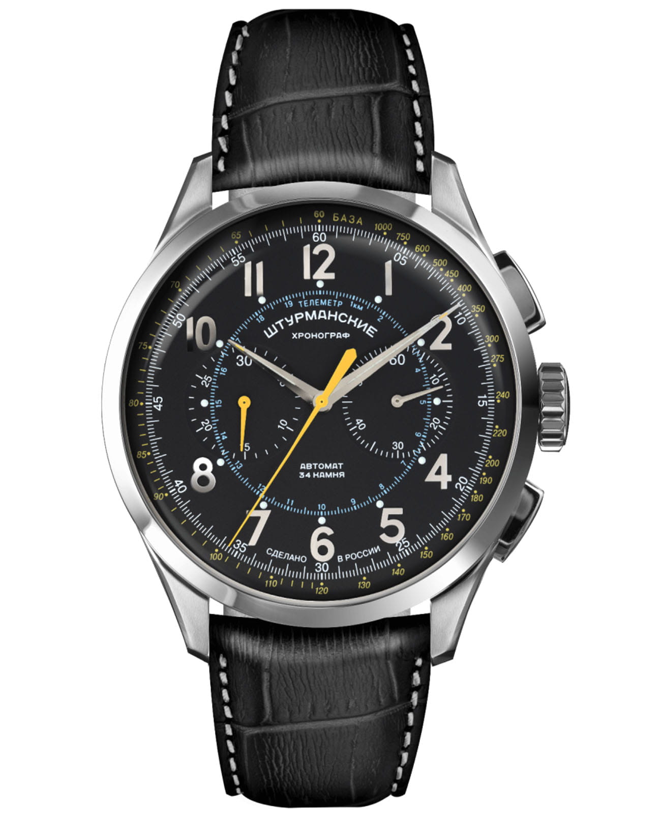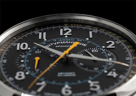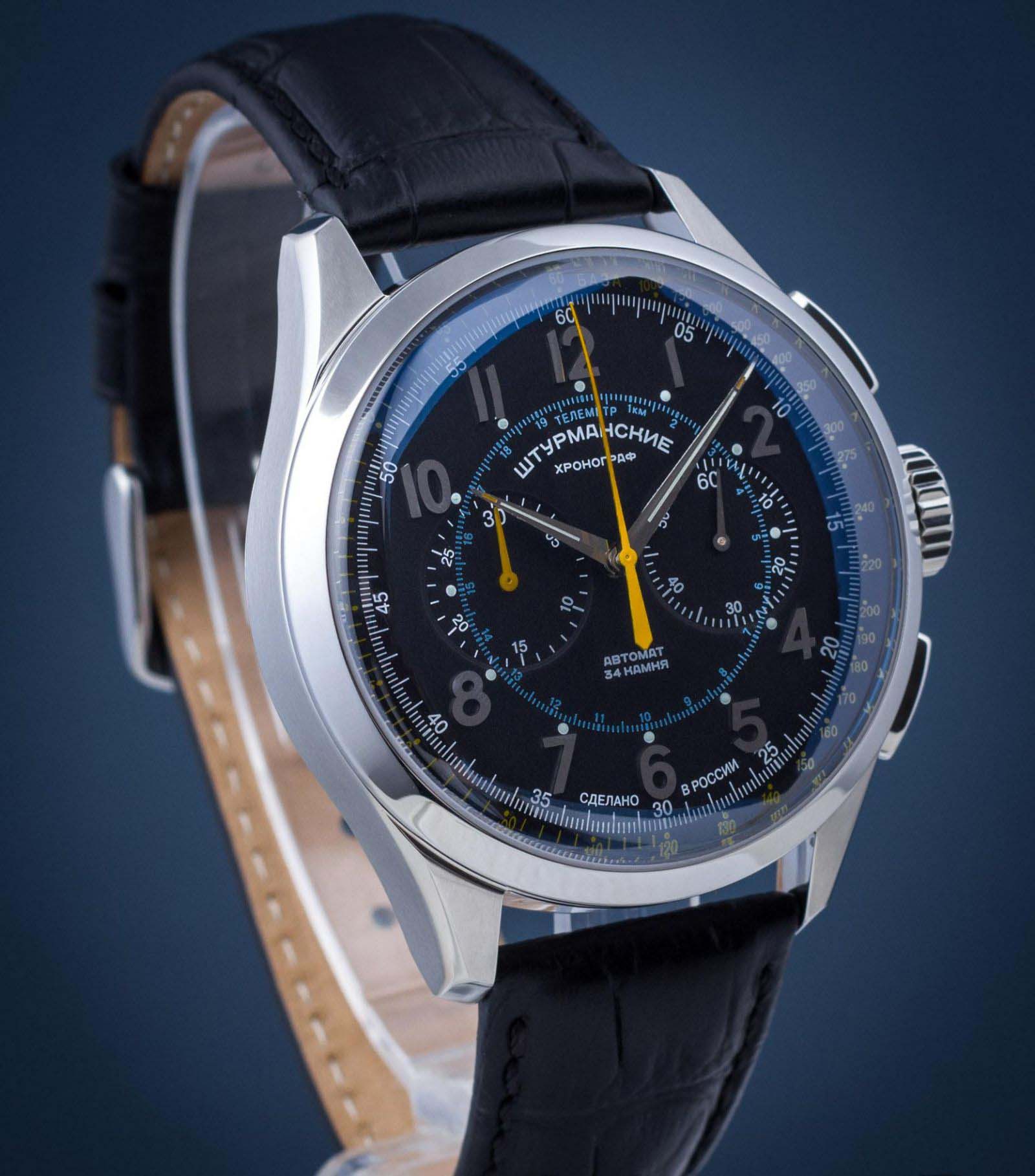 Мужские российские механические часы-хронографХронографФункция позволяет измерять отрезки времени с особой точностью: часы, минуты, секунды. Верным признаком хронографа является наличие на циферблате 3 дополнительных окошек-счётчиков. с секундомеромСекундомерСекундоме́р — прибор, способный измерять интервалы времени с точностью до долей секунды. Штурманские Открытый Космос NE86/1855015, механический механизм (автоматический калибр) с высокой точностью. Сапфировое стеклоСапфировое стеклоПрочный и надёжный материал из кристалла сапфира синтетического происхождения, характеризующийся особой твёрдостью и устойчивостью к царапинам и повреждениям. устойчивое к появлению царапин, обладающее высокой прозрачностью. Класс водозащиты: 50 метров, позволит защитить корпус от случайных брызг или капель дождя. Корпус часов изготовлен из стали. Кожаный ремешок на стандартной застёжке. Стрелки и метки с люминесцентным покрытиемЛюминесцентное покрытиеПозволяет считывать показания времени в темноте. Производители наносят на стрелки, часовые индексы, безель или поверхность циферблата светонакопительный состав, дающий холодное свечение.. Стальной корпус надежно защищает от повреждений механический японский калибр Seiko NE86 на 34 камня с запасом хода 42 часа. Подзавод у часов автоматический.