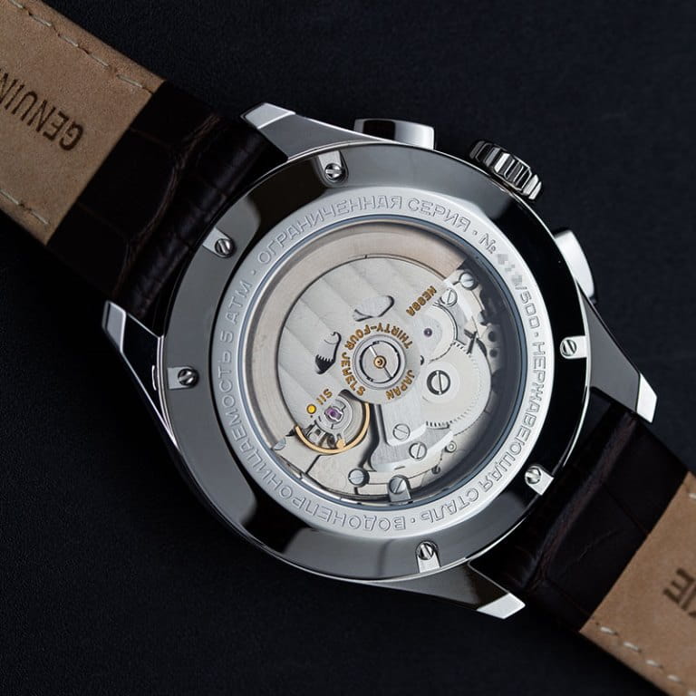 Лимитированные мужские российские механические часы-хронографХронографФункция позволяет измерять отрезки времени с особой точностью: часы, минуты, секунды. Верным признаком хронографа является наличие на циферблате 3 дополнительных окошек-счётчиков. с секундомеромСекундомерСекундоме́р — прибор, способный измерять интервалы времени с точностью до долей секунды. Штурманские Открытый Космос NE88/1859222, механический механизм (автоматический калибр) с высокой точностью. Сапфировое стеклоСапфировое стеклоПрочный и надёжный материал из кристалла сапфира синтетического происхождения, характеризующийся особой твёрдостью и устойчивостью к царапинам и повреждениям. устойчивое к появлению царапин, обладающее высокой прозрачностью. Класс водозащиты: 50 метров, позволит защитить корпус от случайных брызг или капель дождя. Корпус часов изготовлен из стали. Кожаный ремешок на стандартной застёжке. Стрелки и метки с люминесцентным покрытиемЛюминесцентное покрытиеПозволяет считывать показания времени в темноте. Производители наносят на стрелки, часовые индексы, безель или поверхность циферблата светонакопительный состав, дающий холодное свечение.. Стальной корпус с PVD-покрытиемPVDУльтратонкое покрытие наносится в технике вакуумного напыления, сочетает в себе нитрид титана особой прочности со слоем золота или оксида хрома. Несёт в себе декоративную или защитную функцию. надежно защищает от повреждений механический японский калибр Seiko NE88 на 34 камня с запасом хода 42 часа. Подзавод у часов автоматический.