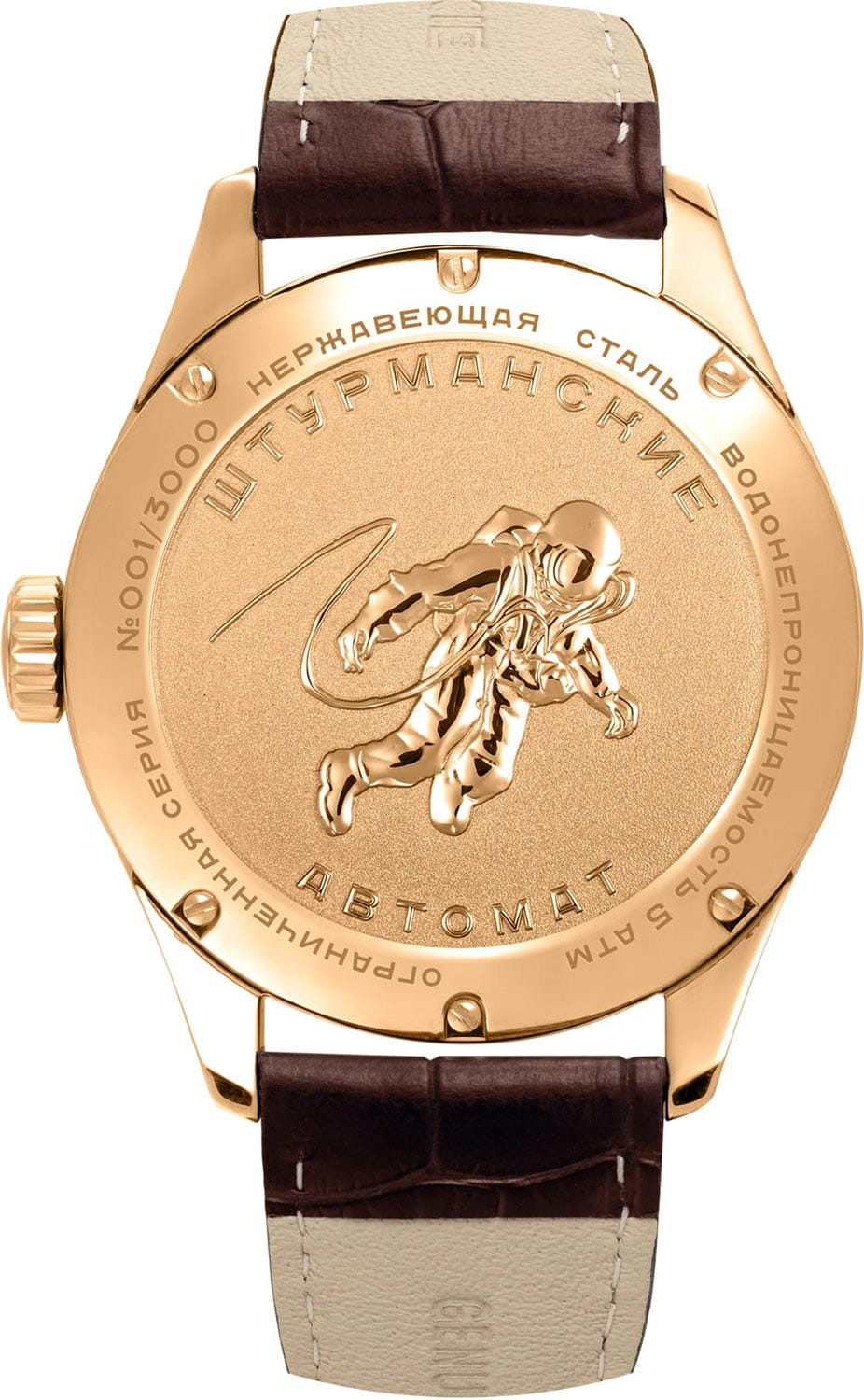 Мужские российские механические часы с минеральным стекломМинеральное стеклоМинеральное стекло представляет собой искусственно выращенный минерал кварца. Такое стекло отличается особой устойчивостью к повреждениям и царапинам. Уступает по некоторым качествам сапфировому стеклу. Штурманские Открытый Космос Day-Date Автомат NH36/1899773, механический механизм (автоматический калибр) с высокой точностью. Лимитированная серия - 3000 экземпляров. Класс водозащиты: 50 метров, позволит защитить корпус от случайных брызг или капель дождя. Корпус часов изготовлен из стали с PVD-покрытиемPVDУльтратонкое покрытие наносится в технике вакуумного напыления, сочетает в себе нитрид титана особой прочности со слоем золота или оксида хрома. Несёт в себе декоративную или защитную функцию.. Кожаный ремешок на стандартной застёжке. Окошки дня недели и даты находятся в положении 3 часа. Сзади украшены изображением астронавта в открытом космосе по мотивам картины Алексея Леонова. 12-ти и 24-х часовой формат времени. В механизме 24 камня, частота 21600 полуколебаний в час. Запас хода 41 час. Противоударное устройство оси баланса. Автоматический подзавод пружины. Накладные метки в виде штрихов сложной формы. Дата и день недели в накладной рамке с двойным окошком. Рифленая заводная головка. Индивидуальная нумерация.