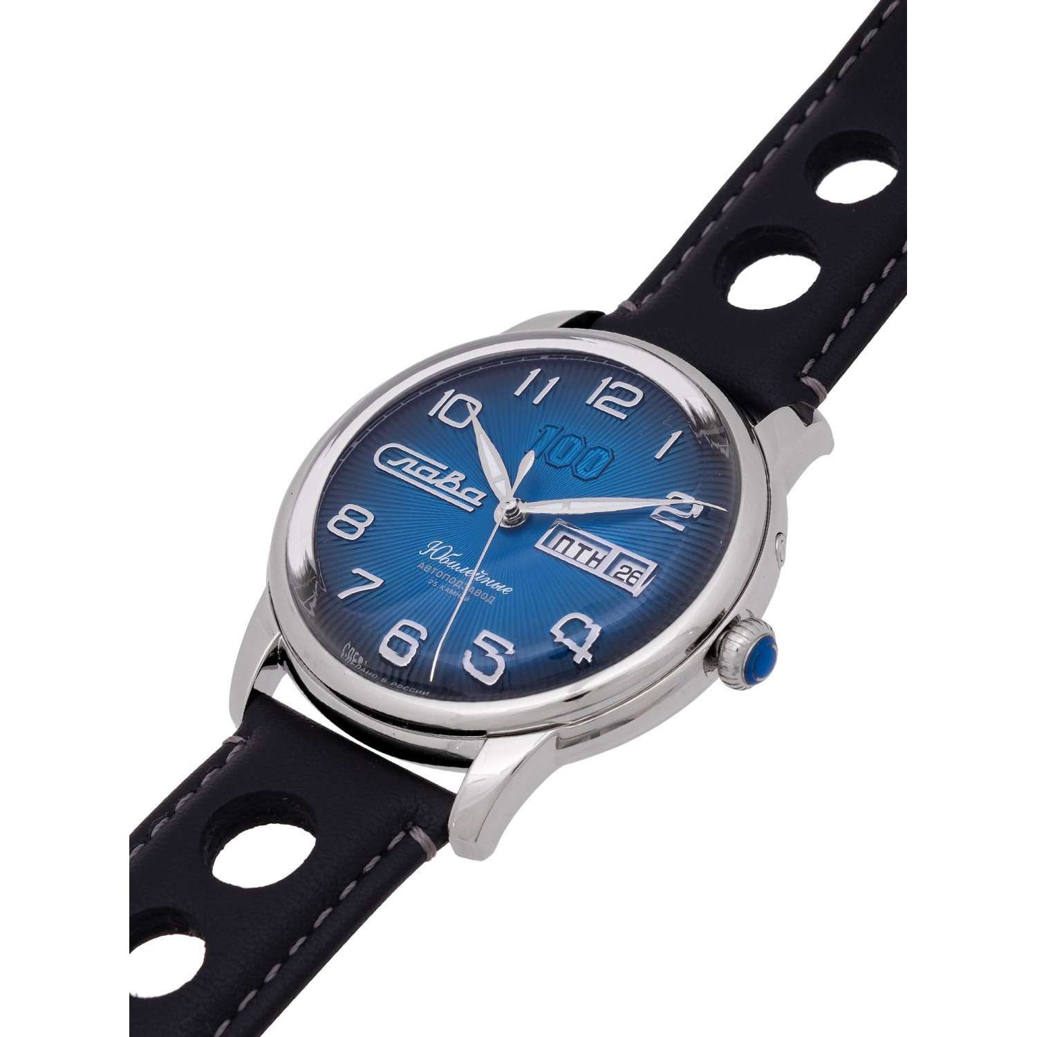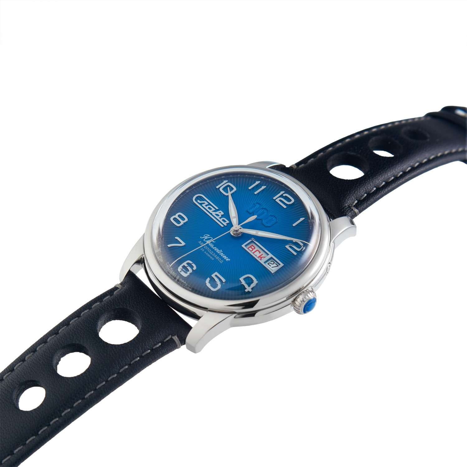 Часы Слава Юбилейные 2600672/300-2427 представляют собой воплощение российского часового искусства, сочетая в себе традиции и современные технологии. Эти механические часы с автоподзаводом оснащены калибром «Слава 2427», который обеспечивает надежную и точную работу. Корпус из высококачественной стали диаметром 44 мм и толщиной 14,5 мм придает часам солидность и долговечность. Циферблат выполнен в благородном синим цвете и оформлен арабскими цифрами, обеспечивая удобство чтения времени. Прочное выпуклое сапфировое стеклоСапфировое стеклоПрочный и надёжный материал из кристалла сапфира синтетического происхождения, характеризующийся особой твёрдостью и устойчивостью к царапинам и повреждениям. защищает циферблат от царапин и повреждений. Особенностью модели является наличие календаря, отображающего число и день недели в положении 3 часа. Стрелки с люминесцентным покрытиемЛюминесцентное покрытиеПозволяет считывать показания времени в темноте. Производители наносят на стрелки, часовые индексы, безель или поверхность циферблата светонакопительный состав, дающий холодное свечение., что облегчает чтение времени даже в условиях слабого освещения. Часы обладают водозащитой уровня 100WR, что делает их подходящими для повседневного ношения и активного образа жизни. Кожаный ремешок с классической застежкой добавляет модели изысканности и комфорта в носке. Эта модель представлена в лимитированной серии из 300 экземпляров, что делает её не только надежным функциональным аксессуаром, но и ценным предметом для коллекционеров. Прозрачная задняя крышка позволяет наблюдать за работой механизма, который включает в себя 25 камней и имеет частоту 18000 полуколебаний в час. Запас хода составляет до 40 часов, а противоударное устройство оси баланса обеспечивает дополнительную надежность.