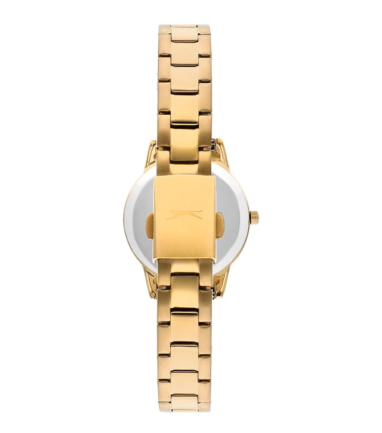 Женские наручные часы Slazenger SL.09.2016.3.02 из коллекции, сочетающей элегантность и практичность в классическом дизайне. Модель обладает круглым корпусом диаметром 32 мм, изготовленным из суперметалла с IP-покрытиемIP-покрытиеМетод ионного напыления. Демонстрирует повышенную устойчивость к истиранию, окислению и химическим веществам. Под воздействием высокого давления и температуры около 1500°C молекулы металла надёжно соединяются с частицами корпуса часов., что обеспечивает высокую устойчивость к внешним воздействиям. Браслет выполнен из того же материала с раскладной застежкойРаскладной замокДанный вариант застежки используется только на часах с металлическим браслетом. Отличительная особенность такого крепления в том, что длина браслета становится универсальной и вы можете самостоятельно отрегулировать нужный вам размер – застежка просто двигается по браслету часов., гарантирующей комфортное ношение и безопасность. Для защиты используется минеральное стеклоМинеральное стеклоМинеральное стекло представляет собой искусственно выращенный минерал кварца. Такое стекло отличается особой устойчивостью к повреждениям и царапинам. Уступает по некоторым качествам сапфировому стеклу., обеспечивающее прочную защиту от царапин. Часы работают на японском кварцевом механизме, что гарантирует точное время без необходимости подзаводки. Водонепроницаемость часов достигает 5 атмосфер (50 метров), что позволяет использовать их для ежедневного использования, включая контакт с водой, но не рекомендуется для плавания или дайвинга.