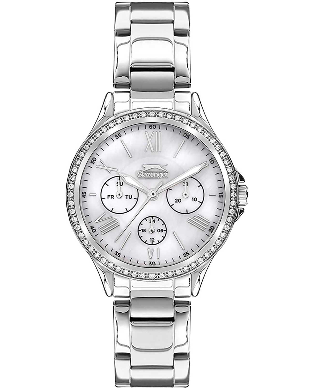 Slazenger SL.09.2021.4.01 – элегантные женские часы, сочетающие стильный дизайн и функциональность. Корпус выполнен из суперметалла, придающим модели роскошный внешний вид.Перламутровый циферблат добавляет изысканности, и защищён минеральным стекломМинеральное стеклоМинеральное стекло представляет собой искусственно выращенный минерал кварца. Такое стекло отличается особой устойчивостью к повреждениям и царапинам. Уступает по некоторым качествам сапфировому стеклу., устойчивым к царапинам. БезельБезельВнешний ободок, закрепляющий стекло. В спортивных часах так называется поворотное кольцо с делениями на циферблате, выполняет роль таймера – замеряет отрезки времени на шкале. Неподвижный безель – элемент декора. Однонаправленно вращающийся безель на дайверских часах позволяет фиксировать моменты погружения и выныривания на поверхность. украшен кристаллами. Часы оснащены точным кварцевым механизмом, обеспечивающим надёжное и стабильное отображение времени. Дополнительные функции включают индикацию дня недели и даты, что повышает практичность использования. Браслет из суперметалла оснащён раскладной застёжкойРаскладная застёжкаТакой тип застёжки используется только на браслетах из металла. Она никогда не раскрывается полностью, происходит разделение на 2 и более частей. Раскладывающая застёжка снизит вероятность потери часов к минимуму., обеспечивающей комфортное ношение и надёжную фиксацию на запястье. Водозащита до 30 метров (3 ATM) защищает часы от случайных брызг и дождя, делая их подходящими для повседневного использования.