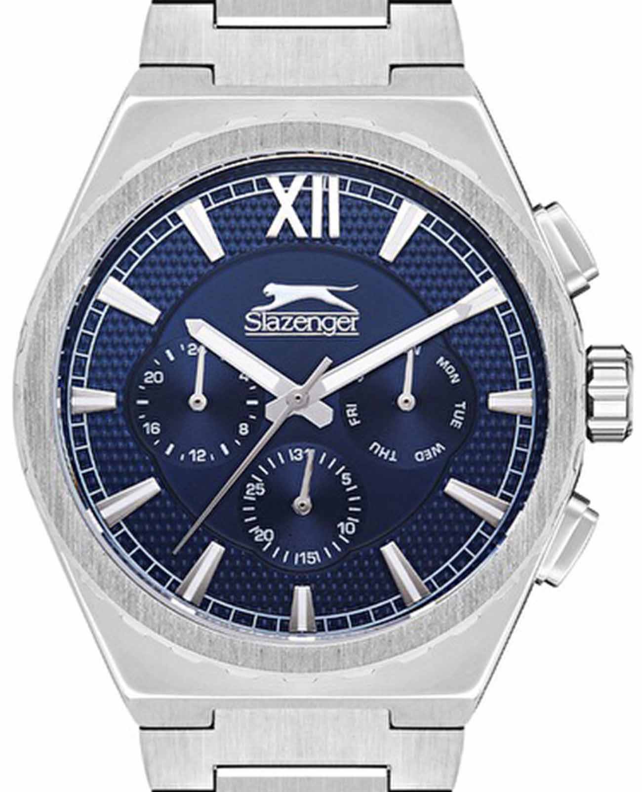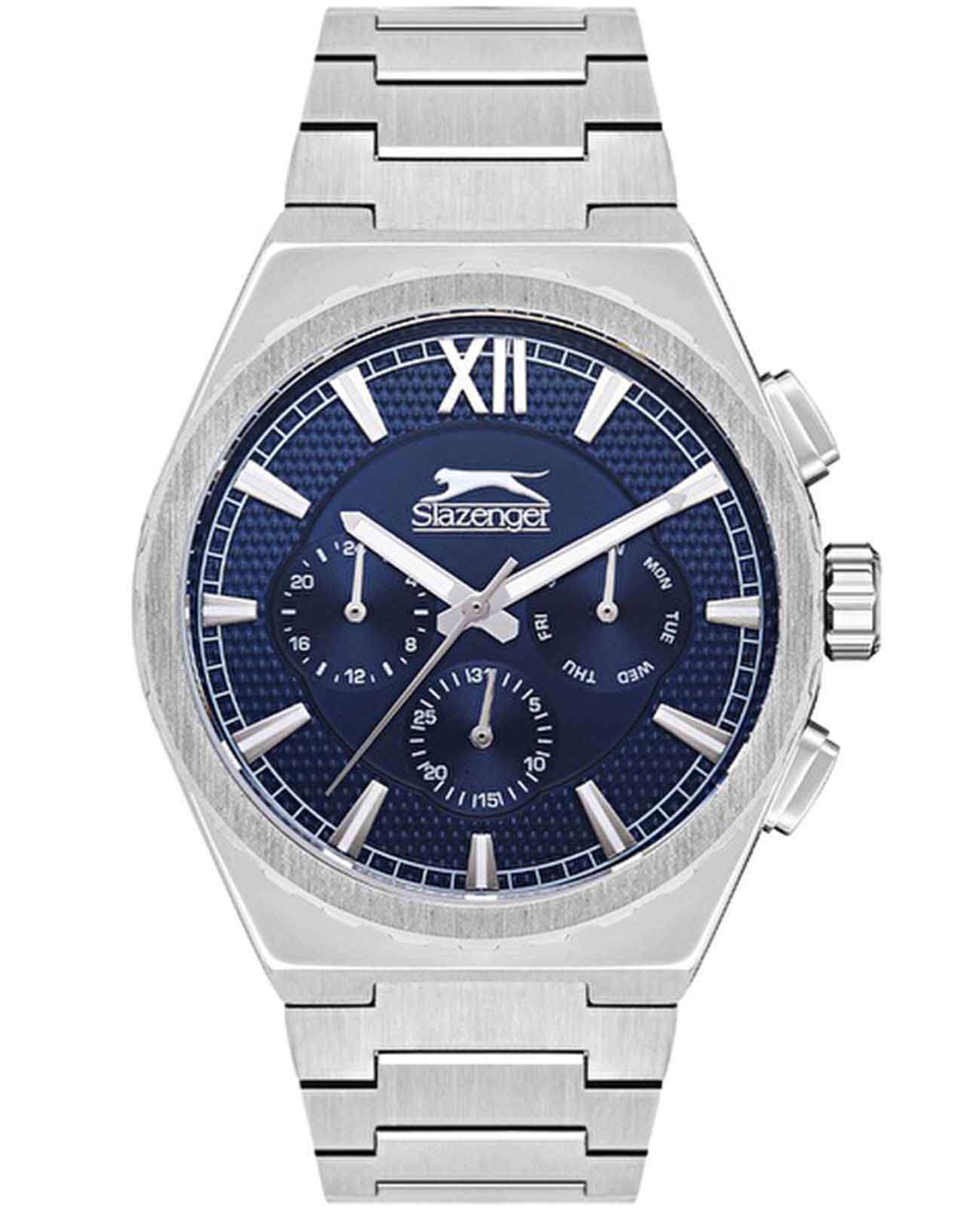 Часы Slazenger SL.09.2128.2.02 воплощают в себе элегантность и практичность, идеально подходящие для современных мужчин. Их синий циферблат, защищенный минеральным стекломМинеральное стеклоМинеральное стекло представляет собой искусственно выращенный минерал кварца. Такое стекло отличается особой устойчивостью к повреждениям и царапинам. Уступает по некоторым качествам сапфировому стеклу., заключен в корпус диаметром 46 мм, изготовленный из прочного суперметалла. Надежный кварцевый механизм обеспечивает точность, а водозащита 5 ATM делает их устойчивыми к воздействию воды. Стальной браслет из суперметалла с раскладной застёжкойРаскладная застёжкаТакой тип застёжки используется только на браслетах из металла. Она никогда не раскрывается полностью, происходит разделение на 2 и более частей. Раскладывающая застёжка снизит вероятность потери часов к минимуму. подчеркивает современный стиль и комфортно сидит на запястье. Часы оснащены 24-часовым указателем времени, а также функциями отображения даты и дня недели. Люминесцентное покрытиеЛюминесцентное покрытиеПозволяет считывать показания времени в темноте. Производители наносят на стрелки, часовые индексы, безель или поверхность циферблата светонакопительный состав, дающий холодное свечение. на стрелках и метках обеспечивает отличную видимость в темноте.