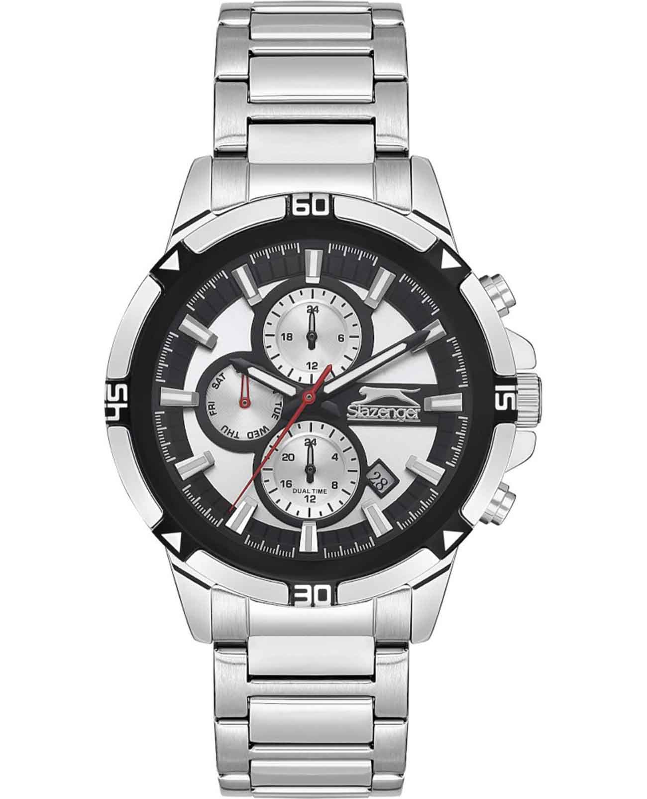 Часы Slazenger SL.09.2249.2.01 — это стильная и практичная модель, выполненная в элегантном серебристом цвете. Корпус и браслет изготовлены из металла, что обеспечивает прочность и долговечность. На безельБезельВнешний ободок, закрепляющий стекло. В спортивных часах так называется поворотное кольцо с делениями на циферблате, выполняет роль таймера – замеряет отрезки времени на шкале. Неподвижный безель – элемент декора. Однонаправленно вращающийся безель на дайверских часах позволяет фиксировать моменты погружения и выныривания на поверхность. частично нанесено черное IP-покрытиеIP-покрытиеМетод ионного напыления. Демонстрирует повышенную устойчивость к истиранию, окислению и химическим веществам. Под воздействием высокого давления и температуры около 1500°C молекулы металла надёжно соединяются с частицами корпуса часов.. Минеральное стеклоМинеральное стеклоМинеральное стекло представляет собой искусственно выращенный минерал кварца. Такое стекло отличается особой устойчивостью к повреждениям и царапинам. Уступает по некоторым качествам сапфировому стеклу. надежно защищает черно-серебристый циферблат от царапин и повреждений. Диаметр корпуса составляет 45 мм, а толщина — 12 мм, благодаря чему часы смотрятся солидно и современно. Модель оснащена кварцевым механизмом, отличающимся точностью и надежностью. На циферблате представлены дополнительные малые циферблаты для отображения второго часового поясаВторой часовой поясФункция, позволяющая отображать время двух часовых поясов одновременно., дня недели и времени в 24-часовом формате, а также имеется отдельное окошко даты. Для удобства использования в темное время суток предусмотрено люминесцентное покрытиеЛюминесцентное покрытиеПозволяет считывать показания времени в темноте. Производители наносят на стрелки, часовые индексы, безель или поверхность циферблата светонакопительный состав, дающий холодное свечение. стрелок и меток. Удобный металлический браслет шириной 22 мм снабжен раскладной застёжкойРаскладная застёжкаТакой тип застёжки используется только на браслетах из металла. Она никогда не раскрывается полностью, происходит разделение на 2 и более частей. Раскладывающая застёжка снизит вероятность потери часов к минимуму., обеспечивающей надежную фиксацию на запястье. Заводная головка оснащена защитой. Водозащита уровня WR 50 позволяет не снимать часы при мытье рук или попадании под дождь. Вес модели составляет 151 грамм.