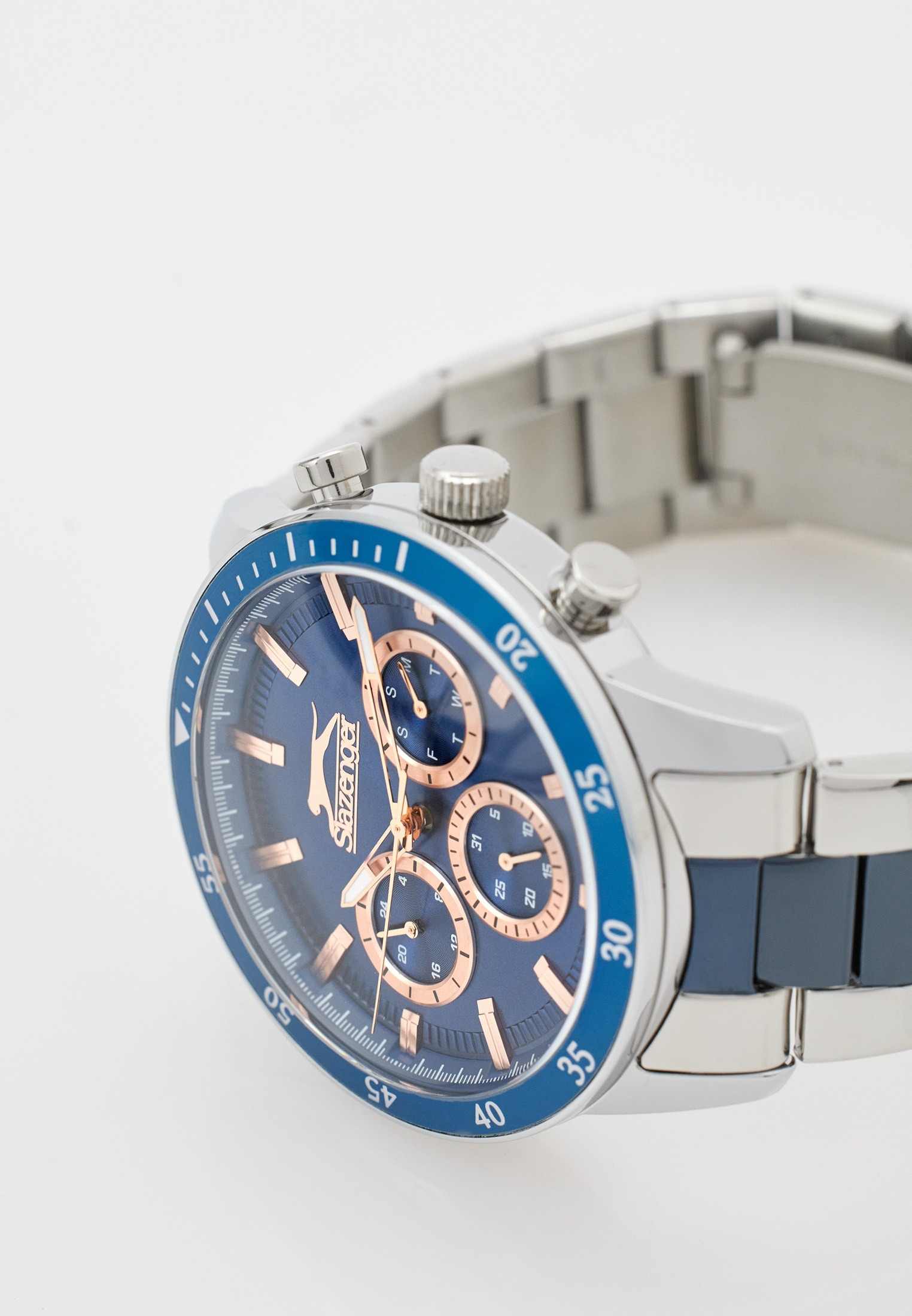 Часы Slazenger SL.09.2260.2.06 сочетают в себе выразительный дизайн и практичность, делая их отличным выбором для современного мужчины. Корпус и браслет выполнены из суперметалла — прочного сплава на основе меди с низким содержанием цинка и никеля, что обеспечивает долговечность изделия. На безельБезельВнешний ободок, закрепляющий стекло. В спортивных часах так называется поворотное кольцо с делениями на циферблате, выполняет роль таймера – замеряет отрезки времени на шкале. Неподвижный безель – элемент декора. Однонаправленно вращающийся безель на дайверских часах позволяет фиксировать моменты погружения и выныривания на поверхность. нанесено синее IP-покрытиеIP-покрытиеМетод ионного напыления. Демонстрирует повышенную устойчивость к истиранию, окислению и химическим веществам. Под воздействием высокого давления и температуры около 1500°C молекулы металла надёжно соединяются с частицами корпуса часов., что придает аксессуару утончённый и универсальный внешний вид. Модель оснащена точным кварцевым механизмом, защищённым минеральным стекломМинеральное стеклоМинеральное стекло представляет собой искусственно выращенный минерал кварца. Такое стекло отличается особой устойчивостью к повреждениям и царапинам. Уступает по некоторым качествам сапфировому стеклу.. На синем циферблате размещены дополнительные индикаторы: 24-часовой формат времени, дата и день недели. Класс водозащиты 5 бар позволяет не беспокоиться о брызгах и дожде. Диаметр корпуса составляет 45 мм, толщина — 12 мм, что придаёт часам солидный и современный вид. Стрелки с люминесцентным покрытиемЛюминесцентное покрытиеПозволяет считывать показания времени в темноте. Производители наносят на стрелки, часовые индексы, безель или поверхность циферблата светонакопительный состав, дающий холодное свечение. удобно подсвечиваются в темноте после зарядки на свету. Стальной браслет с синим IP-покрытиемIP-покрытиеМетод ионного напыления. Демонстрирует повышенную устойчивость к истиранию, окислению и химическим веществам. Под воздействием высокого давления и температуры около 1500°C молекулы металла надёжно соединяются с частицами корпуса часов. с раскладной застёжкойРаскладная застёжкаТакой тип застёжки используется только на браслетах из металла. Она никогда не раскрывается полностью, происходит разделение на 2 и более частей. Раскладывающая застёжка снизит вероятность потери часов к минимуму. обеспечивает комфортную посадку. Модель станет надёжным спутником как на каждый день, так и для особых случаев, а также превосходно подойдёт в качестве подарка. Гарантия от производителя — 12 месяцев.