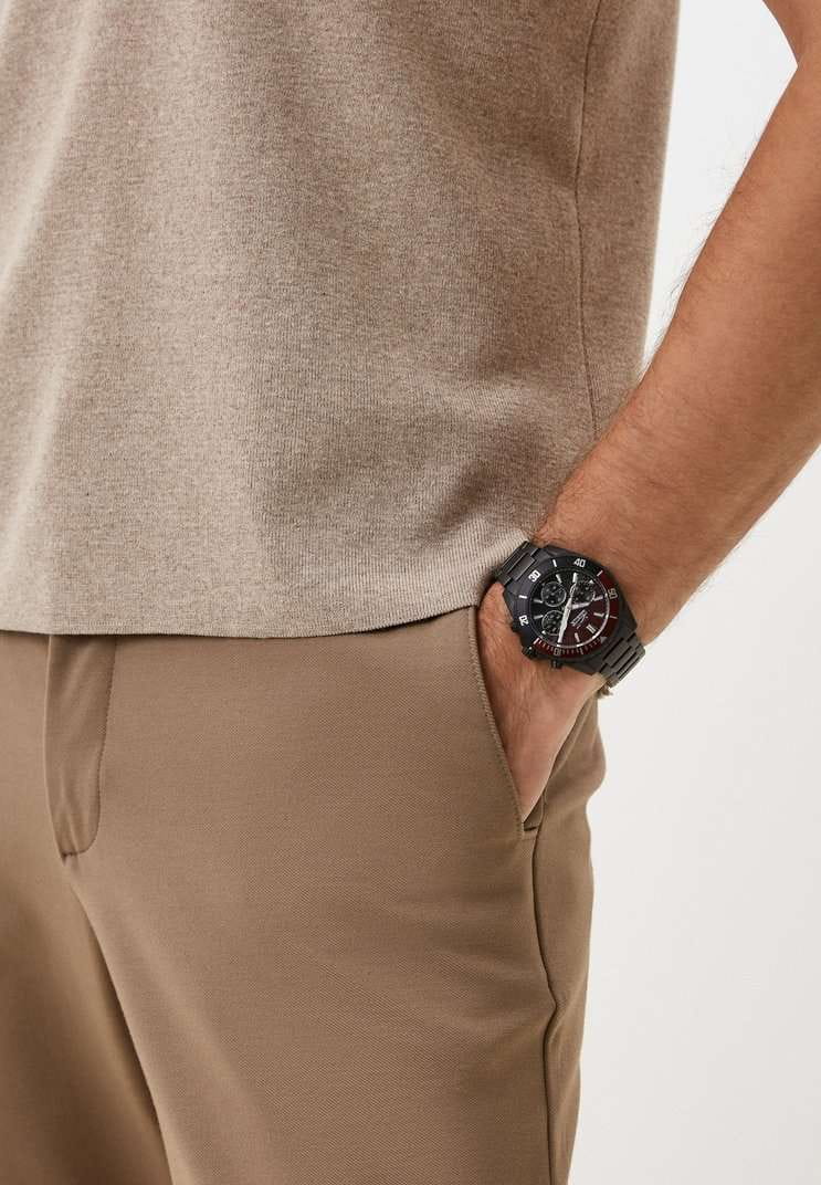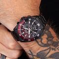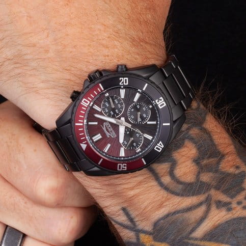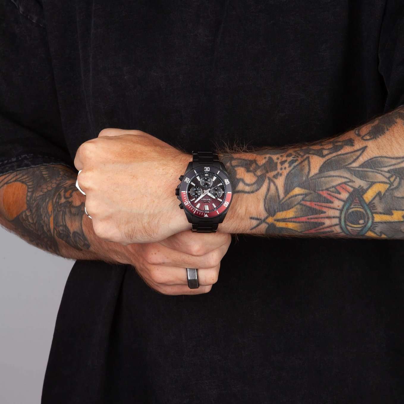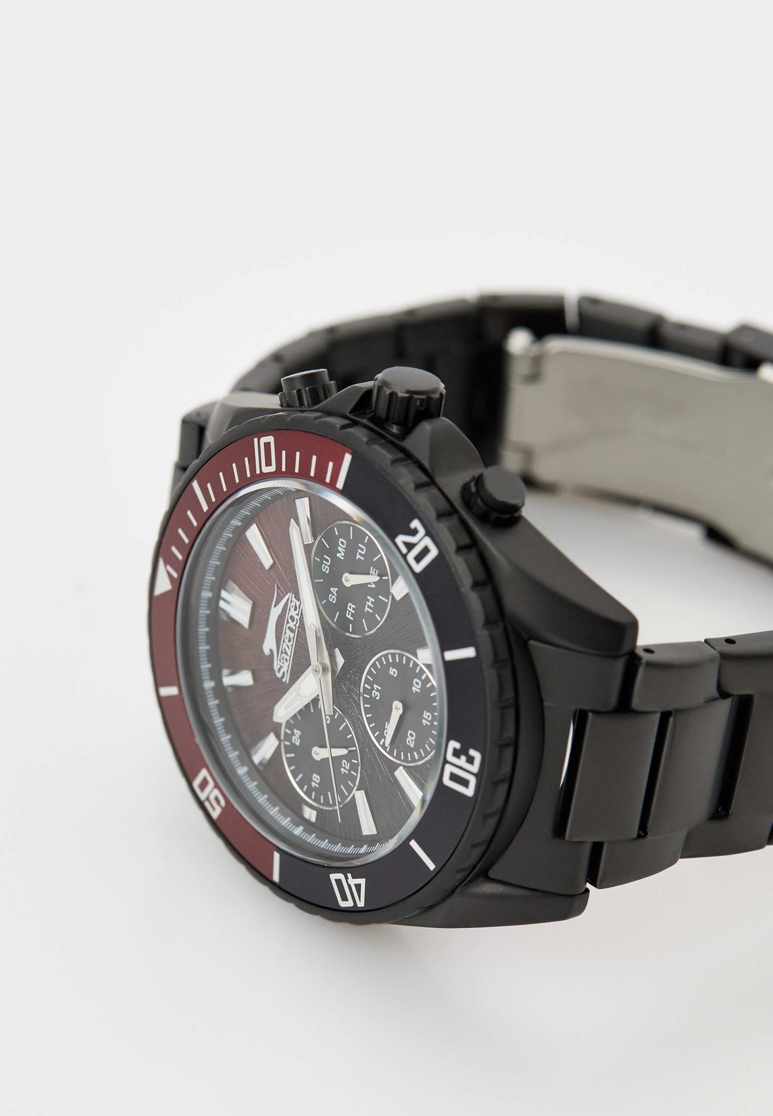 Часы Slazenger SL.09.2273.2.06 – стильный и функциональный аксессуар, который станет достойным дополнением к вашему образу. Модель оснащена надежным кварцевым механизмом, заключенным в корпус из инновационного суперметалла с черным  IP-покрытиемIP-покрытиеМетод ионного напыления. Демонстрирует повышенную устойчивость к истиранию, окислению и химическим веществам. Под воздействием высокого давления и температуры около 1500°C молекулы металла надёжно соединяются с частицами корпуса часов. – прочного сплава на основе меди с пониженным содержанием цинка и никеля и специальным покрытием, устойчивым к износу. На безельБезельВнешний ободок, закрепляющий стекло. В спортивных часах так называется поворотное кольцо с делениями на циферблате, выполняет роль таймера – замеряет отрезки времени на шкале. Неподвижный безель – элемент декора. Однонаправленно вращающийся безель на дайверских часах позволяет фиксировать моменты погружения и выныривания на поверхность. нанесено черное и красное IP-покрытиеIP-покрытиеМетод ионного напыления. Демонстрирует повышенную устойчивость к истиранию, окислению и химическим веществам. Под воздействием высокого давления и температуры около 1500°C молекулы металла надёжно соединяются с частицами корпуса часов., что придает аксессуару утончённый и универсальный внешний вид. Чёрно-красный циферблат под минеральным стекломМинеральное стеклоМинеральное стекло представляет собой искусственно выращенный минерал кварца. Такое стекло отличается особой устойчивостью к повреждениям и царапинам. Уступает по некоторым качествам сапфировому стеклу. дополнен отдельными счетчиками: 24-часовой указатель времени, индикаторы даты и дня недели. Диаметр корпуса составляет 44 мм, а толщина – 12 мм, что обеспечивает комфортную посадку на запястье и подчёркивает современный стиль часов.  Браслет из суперметалла с IP-покрытиемIP-покрытиеМетод ионного напыления. Демонстрирует повышенную устойчивость к истиранию, окислению и химическим веществам. Под воздействием высокого давления и температуры около 1500°C молекулы металла надёжно соединяются с частицами корпуса часов. и с раскладной застёжкойРаскладная застёжкаТакой тип застёжки используется только на браслетах из металла. Она никогда не раскрывается полностью, происходит разделение на 2 и более частей. Раскладывающая застёжка снизит вероятность потери часов к минимуму. обеспечивает комфортную посадку. Стрелки и метки с люминесцентным покрытиемЛюминесцентное покрытиеПозволяет считывать показания времени в темноте. Производители наносят на стрелки, часовые индексы, безель или поверхность циферблата светонакопительный состав, дающий холодное свечение. удобно подсвечиваются в темноте после зарядки на свету. Водонепроницаемость 5 АТМ защищает механизм от брызг и дождя, позволяя не беспокоиться о сохранности аксессуара в повседневной жизни. Эта модель станет отличным выбором для ежедневного ношения или особых случаев и прекрасным подарком для мужчины к любому празднику.