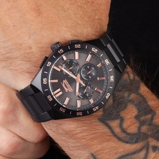 Часы Slazenger SL.09.2285.2.05 — это стильное решение для тех, кто ценит сочетание выразительного дизайна и функциональности. Модель оснащена надежным кварцевым механизмом, который заключен в прочный корпус диаметром 45 мм и толщиной 13 мм, выполненный из суперметалла с черным IP-покрытиемIP-покрытиеМетод ионного напыления. Демонстрирует повышенную устойчивость к истиранию, окислению и химическим веществам. Под воздействием высокого давления и температуры около 1500°C молекулы металла надёжно соединяются с частицами корпуса часов. — современного сплава на основе меди с пониженным содержанием цинка и никеля, обладающего высокой прочностью и устойчивостью к износу, а на безельБезельВнешний ободок, закрепляющий стекло. В спортивных часах так называется поворотное кольцо с делениями на циферблате, выполняет роль таймера – замеряет отрезки времени на шкале. Неподвижный безель – элемент декора. Однонаправленно вращающийся безель на дайверских часах позволяет фиксировать моменты погружения и выныривания на поверхность. нанесено черное IP-покрытиеIP-покрытиеМетод ионного напыления. Демонстрирует повышенную устойчивость к истиранию, окислению и химическим веществам. Под воздействием высокого давления и температуры около 1500°C молекулы металла надёжно соединяются с частицами корпуса часов. и секундная шкала. Минеральное стеклоМинеральное стеклоМинеральное стекло представляет собой искусственно выращенный минерал кварца. Такое стекло отличается особой устойчивостью к повреждениям и царапинам. Уступает по некоторым качествам сапфировому стеклу. защищает черный циферблат от царапин и повреждений. Часы оснащены дополнительными циферблатами для отображения 24-часового времени, даты и дня недели, что делает использование еще более удобным. Браслет также выполнен из суперметалла с черным IP-покрытиемIP-покрытиеМетод ионного напыления. Демонстрирует повышенную устойчивость к истиранию, окислению и химическим веществам. Под воздействием высокого давления и температуры около 1500°C молекулы металла надёжно соединяются с частицами корпуса часов. и с раскладной застёжкойРаскладная застёжкаТакой тип застёжки используется только на браслетах из металла. Она никогда не раскрывается полностью, происходит разделение на 2 и более частей. Раскладывающая застёжка снизит вероятность потери часов к минимуму. и гармонично дополняет общий облик аксессуара. Циферблат оснащён люминесцентным покрытиемЛюминесцентное покрытиеПозволяет считывать показания времени в темноте. Производители наносят на стрелки, часовые индексы, безель или поверхность циферблата светонакопительный состав, дающий холодное свечение. стрелок и меток, что позволяет легко определять время даже в условиях плохой освещенности. Класс водозащиты 5 АТМ позволяет не бояться случайных брызг и дождя, а гарантия 12 месяцев подтверждает высокое качество изделия.