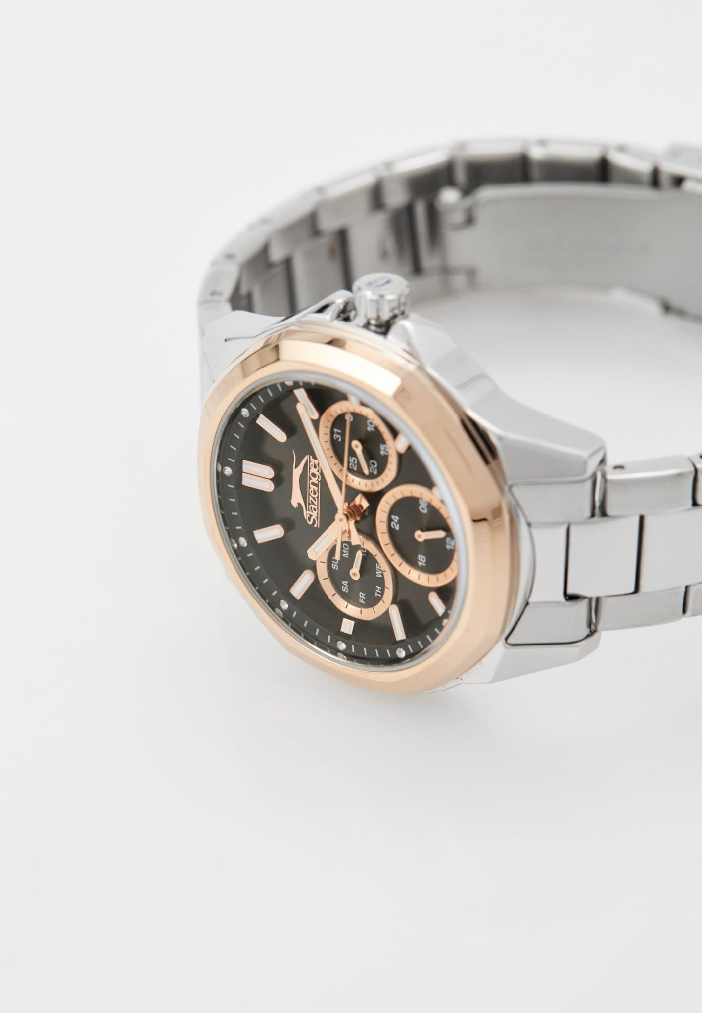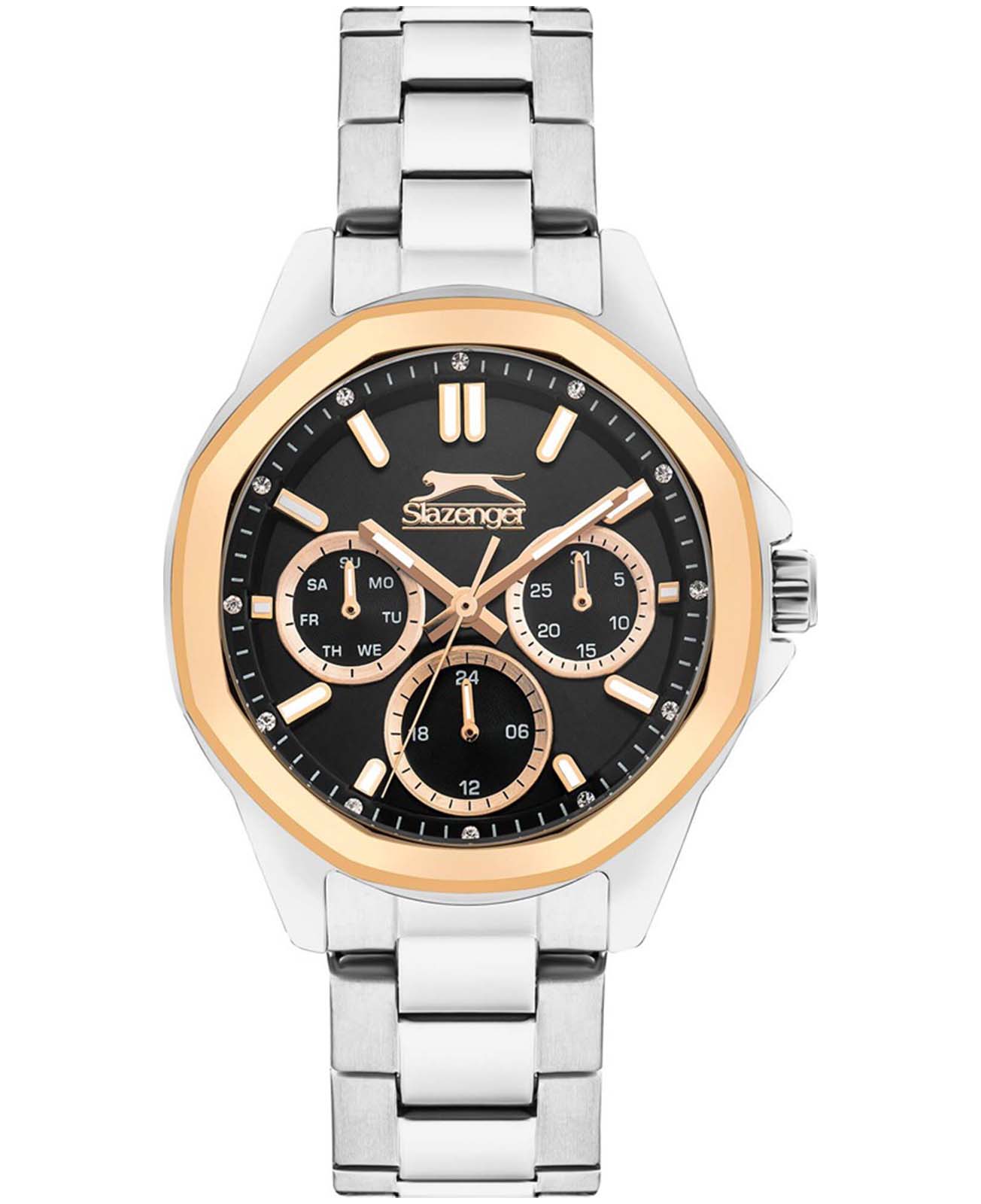 Часы Slazenger SL.09.2290.4.03 — это сочетание современного дизайна и функциональности, идеально подходящее для тех, кто ценит стиль и элегантность. Корпус и браслет выполнены из прочного суперметалла, что придаёт модели солидный и эффектный вид. Черный циферблат с лаконичными отметками, кристаллами и фирменным логотипом защищён устойчивым к царапинам минеральным стекломМинеральное стеклоМинеральное стекло представляет собой искусственно выращенный минерал кварца. Такое стекло отличается особой устойчивостью к повреждениям и царапинам. Уступает по некоторым качествам сапфировому стеклу.. Особое внимание привлекает восьмигранный безельБезельВнешний ободок, закрепляющий стекло. В спортивных часах так называется поворотное кольцо с делениями на циферблате, выполняет роль таймера – замеряет отрезки времени на шкале. Неподвижный безель – элемент декора. Однонаправленно вращающийся безель на дайверских часах позволяет фиксировать моменты погружения и выныривания на поверхность. с розово-золотистым IP-покрытиемIP-покрытиеМетод ионного напыления. Демонстрирует повышенную устойчивость к истиранию, окислению и химическим веществам. Под воздействием высокого давления и температуры около 1500°C молекулы металла надёжно соединяются с частицами корпуса часов.. Дополнительные функции включают отображение даты и дня недели, а также 12- и 24-часовой формат времени на отдельных мини-циферблатах, что делает использование часов максимально удобным. Заводная головка оснащена защитой, а надёжная раскладная застёжкаРаскладная застёжкаТакой тип застёжки используется только на браслетах из металла. Она никогда не раскрывается полностью, происходит разделение на 2 и более частей. Раскладывающая застёжка снизит вероятность потери часов к минимуму. обеспечивает комфортную посадку на запястье. Особое внимание привлекает восьмигранный безельБезельВнешний ободок, закрепляющий стекло. В спортивных часах так называется поворотное кольцо с делениями на циферблате, выполняет роль таймера – замеряет отрезки времени на шкале. Неподвижный безель – элемент декора. Однонаправленно вращающийся безель на дайверских часах позволяет фиксировать моменты погружения и выныривания на поверхность.. Циферблат оснащён люминесцентным покрытиемЛюминесцентное покрытиеПозволяет считывать показания времени в темноте. Производители наносят на стрелки, часовые индексы, безель или поверхность циферблата светонакопительный состав, дающий холодное свечение. стрелок и меток, что позволяет легко определять время даже в условиях плохой освещенности. Водозащита 30WR позволяет не беспокоиться о случайных брызгах и дождевых каплях. Диаметр корпуса составляет 36 мм, толщина — 12 мм, вес — 97 г, благодаря чему часы выглядят внушительно и подчёркивают индивидуальный стиль владельца. Эта модель станет отличным акцентом в вашем образе и подчеркнёт вашу уверенность в любой ситуации.