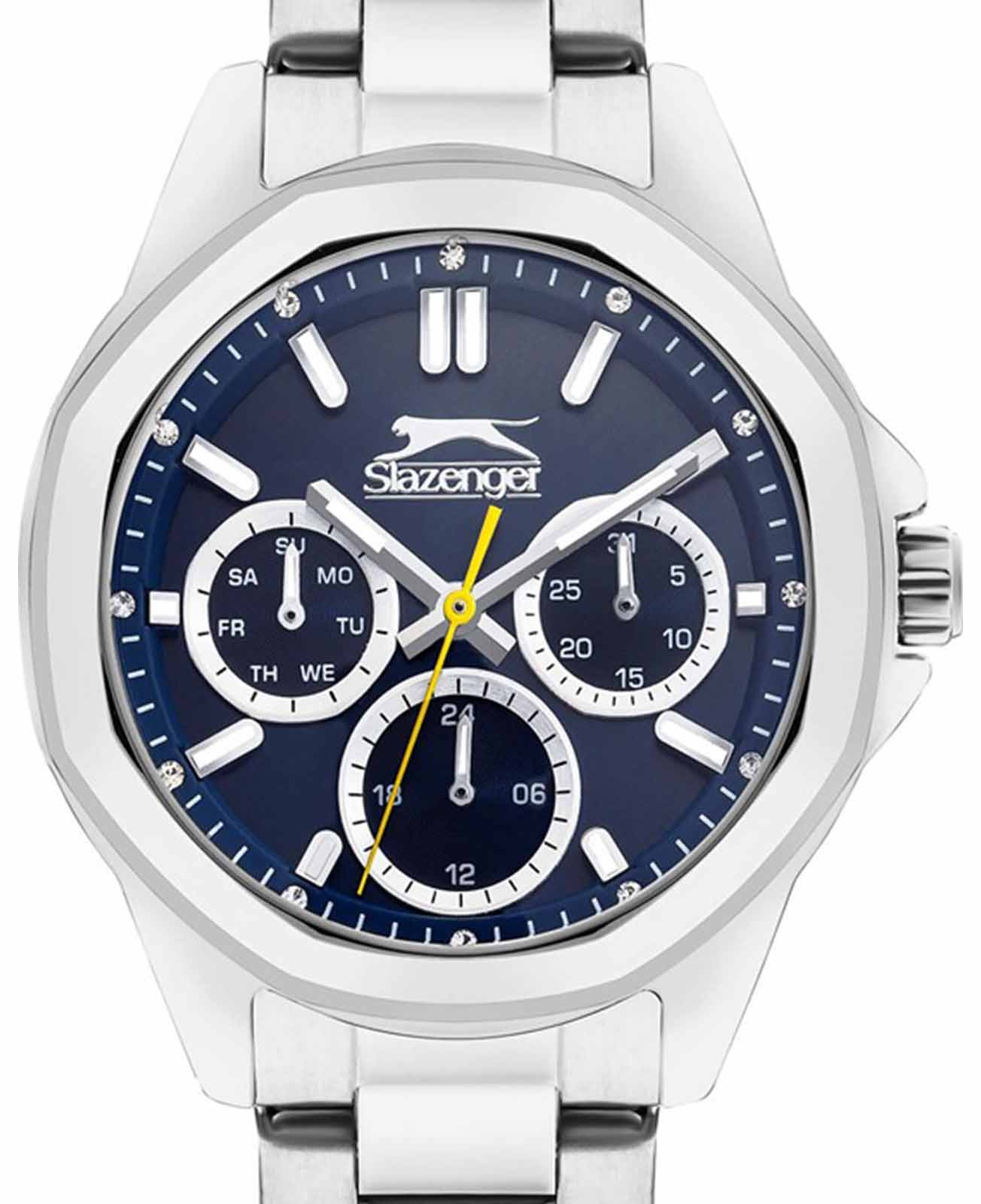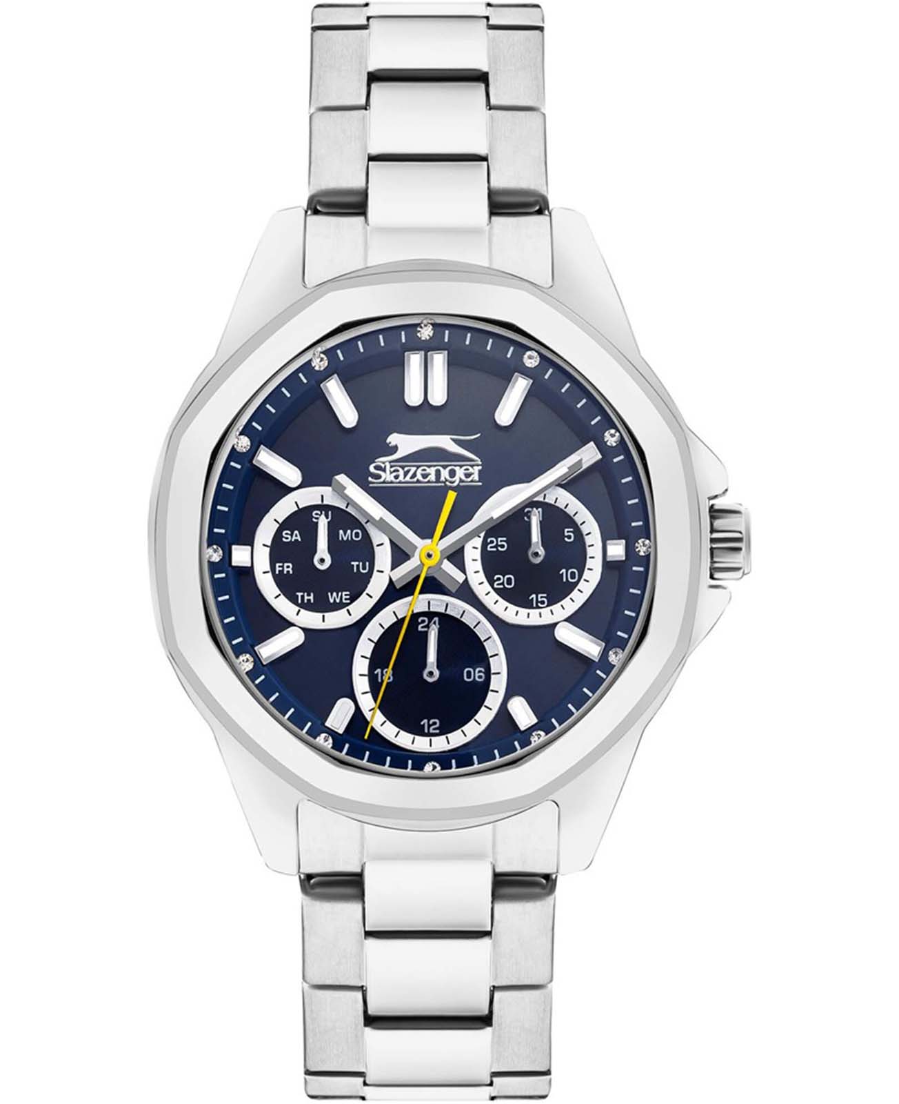 Часы Slazenger SL.09.2290.4.05 — это сочетание современного дизайна и функциональности, идеально подходящее для тех, кто ценит стиль и элегантность. Корпус и браслет выполнены из прочного суперметалла, что придаёт модели солидный и эффектный вид. Синий циферблат с лаконичными отметками, кристаллами и фирменным логотипом защищён устойчивым к царапинам минеральным стекломМинеральное стеклоМинеральное стекло представляет собой искусственно выращенный минерал кварца. Такое стекло отличается особой устойчивостью к повреждениям и царапинам. Уступает по некоторым качествам сапфировому стеклу.. Дополнительные функции включают отображение даты и дня недели, а также 12- и 24-часовой формат времени на отдельных мини-циферблатах, что делает использование часов максимально удобным. Заводная головка оснащена защитой, а надёжная раскладная застёжкаРаскладная застёжкаТакой тип застёжки используется только на браслетах из металла. Она никогда не раскрывается полностью, происходит разделение на 2 и более частей. Раскладывающая застёжка снизит вероятность потери часов к минимуму. обеспечивает комфортную посадку на запястье. Особое внимание привлекает восьмигранный безельБезельВнешний ободок, закрепляющий стекло. В спортивных часах так называется поворотное кольцо с делениями на циферблате, выполняет роль таймера – замеряет отрезки времени на шкале. Неподвижный безель – элемент декора. Однонаправленно вращающийся безель на дайверских часах позволяет фиксировать моменты погружения и выныривания на поверхность.. Циферблат оснащён люминесцентным покрытиемЛюминесцентное покрытиеПозволяет считывать показания времени в темноте. Производители наносят на стрелки, часовые индексы, безель или поверхность циферблата светонакопительный состав, дающий холодное свечение. стрелок и меток, что позволяет легко определять время даже в условиях плохой освещенности. Водозащита 30WR позволяет не беспокоиться о случайных брызгах и дождевых каплях. Диаметр корпуса составляет 36 мм, толщина — 12 мм, вес — 97 г, благодаря чему часы выглядят внушительно и подчёркивают индивидуальный стиль владельца. Эта модель станет отличным акцентом в вашем образе и подчеркнёт вашу уверенность в любой ситуации.