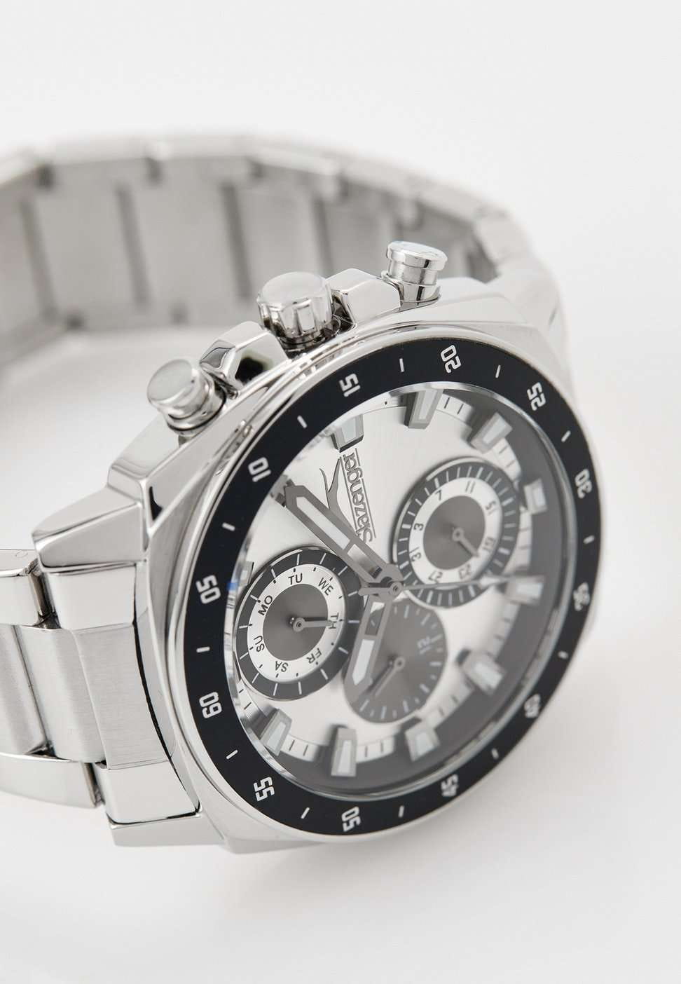 Slazenger SL.09.2292.2.05 — это стильные наручные часы, выполненные в современном дизайне и отлично подходящие для повседневного использования. Корпус диаметром 45 мм изготовлен из прочного металла и дополнен минеральным стекломМинеральное стеклоМинеральное стекло представляет собой искусственно выращенный минерал кварца. Такое стекло отличается особой устойчивостью к повреждениям и царапинам. Уступает по некоторым качествам сапфировому стеклу., которое защищает серебристый циферблат. Серебристый металлический браслет шириной 24 мм оснащён надежной раскладной застёжкойРаскладная застёжкаТакой тип застёжки используется только на браслетах из металла. Она никогда не раскрывается полностью, происходит разделение на 2 и более частей. Раскладывающая застёжка снизит вероятность потери часов к минимуму., которая обеспечивает комфортную посадку на руке. Кварцевый механизм гарантирует точный ход, а водозащита уровня WR 50 позволяет не снимать часы во время мытья рук или под дождём. Модель оснащена люминесцентным покрытиемЛюминесцентное покрытиеПозволяет считывать показания времени в темноте. Производители наносят на стрелки, часовые индексы, безель или поверхность циферблата светонакопительный состав, дающий холодное свечение. стрелок и меток, что облегчает считывание времени в темноте. Дополнительные малые циферблаты отображают дату, день недели и текущее время в 24-часовом формате. Часы также оснащены заводной головкой с защитой и безелемБезельВнешний ободок, закрепляющий стекло. В спортивных часах так называется поворотное кольцо с делениями на циферблате, выполняет роль таймера – замеряет отрезки времени на шкале. Неподвижный безель – элемент декора. Однонаправленно вращающийся безель на дайверских часах позволяет фиксировать моменты погружения и выныривания на поверхность. с черным IP-покрытиемIP-покрытиеМетод ионного напыления. Демонстрирует повышенную устойчивость к истиранию, окислению и химическим веществам. Под воздействием высокого давления и температуры около 1500°C молекулы металла надёжно соединяются с частицами корпуса часов. и секундной разметкой. Вес изделия составляет 173 грамма.