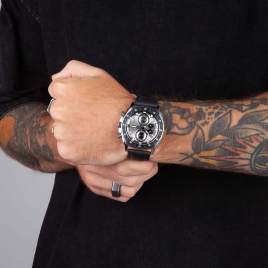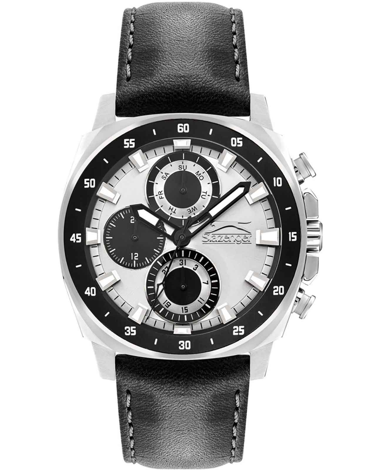 Slazenger SL.09.2293.2.04 — это стильные наручные часы, выполненные в современном дизайне и отлично подходящие для повседневного использования. Корпус диаметром 45 мм изготовлен из прочного металла и дополнен минеральным стекломМинеральное стеклоМинеральное стекло представляет собой искусственно выращенный минерал кварца. Такое стекло отличается особой устойчивостью к повреждениям и царапинам. Уступает по некоторым качествам сапфировому стеклу., которое защищает серебристый циферблат. Черный кожаный ремешок шириной 24 мм оснащён надежной классической застежкой, которая обеспечивает комфортную посадку на руке. Кварцевый механизм гарантирует точный ход, а водозащита уровня WR 50 позволяет не снимать часы во время мытья рук или под дождём. Модель оснащена люминесцентным покрытиемЛюминесцентное покрытиеПозволяет считывать показания времени в темноте. Производители наносят на стрелки, часовые индексы, безель или поверхность циферблата светонакопительный состав, дающий холодное свечение. стрелок и меток, что облегчает считывание времени в темноте. Дополнительные малые циферблаты отображают дату, день недели и текущее время в 24-часовом формате. Часы также оснащены заводной головкой с защитой и безелемБезельВнешний ободок, закрепляющий стекло. В спортивных часах так называется поворотное кольцо с делениями на циферблате, выполняет роль таймера – замеряет отрезки времени на шкале. Неподвижный безель – элемент декора. Однонаправленно вращающийся безель на дайверских часах позволяет фиксировать моменты погружения и выныривания на поверхность. с черным IP-покрытиемIP-покрытиеМетод ионного напыления. Демонстрирует повышенную устойчивость к истиранию, окислению и химическим веществам. Под воздействием высокого давления и температуры около 1500°C молекулы металла надёжно соединяются с частицами корпуса часов. и секундной разметкой. Вес изделия составляет 80 грамм.
