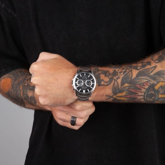 Мужские кварцевые часы Slazenger SL.09.2300.2.01 — это выразительный и функциональный аксессуар, сочетающий прочность, стиль и насыщенную комплектацию. Корпус и браслет выполнены из суперметалла, защищён минеральным стекломМинеральное стеклоМинеральное стекло представляет собой искусственно выращенный минерал кварца. Такое стекло отличается особой устойчивостью к повреждениям и царапинам. Уступает по некоторым качествам сапфировому стеклу.. Циферблат чёрного цвета оформлен с вынесенными малыми циферблатами для индикации дня недели, даты и времени в 24-часовом формате. Заводная головка снабжена защитой, а задняя крышка — завинчивающаяся, что обеспечивает повышенную надёжность конструкции. Стрелки оснащены люминесцентным покрытиемЛюминесцентное покрытиеПозволяет считывать показания времени в темноте. Производители наносят на стрелки, часовые индексы, безель или поверхность циферблата светонакопительный состав, дающий холодное свечение., обеспечивающим хорошую читаемость в темноте. Браслет фиксируется на раскладной застёжкеРаскладная застёжкаТакой тип застёжки используется только на браслетах из металла. Она никогда не раскрывается полностью, происходит разделение на 2 и более частей. Раскладывающая застёжка снизит вероятность потери часов к минимуму., обеспечивая удобство и безопасность ношения. Водонепроницаемость 50 м позволяет использовать часы в повседневных условиях, защищая от случайных брызг и капель дождя. Модель подчёркивает индивидуальность владельца и идеально подходит как для повседневного, так и для делового образа.