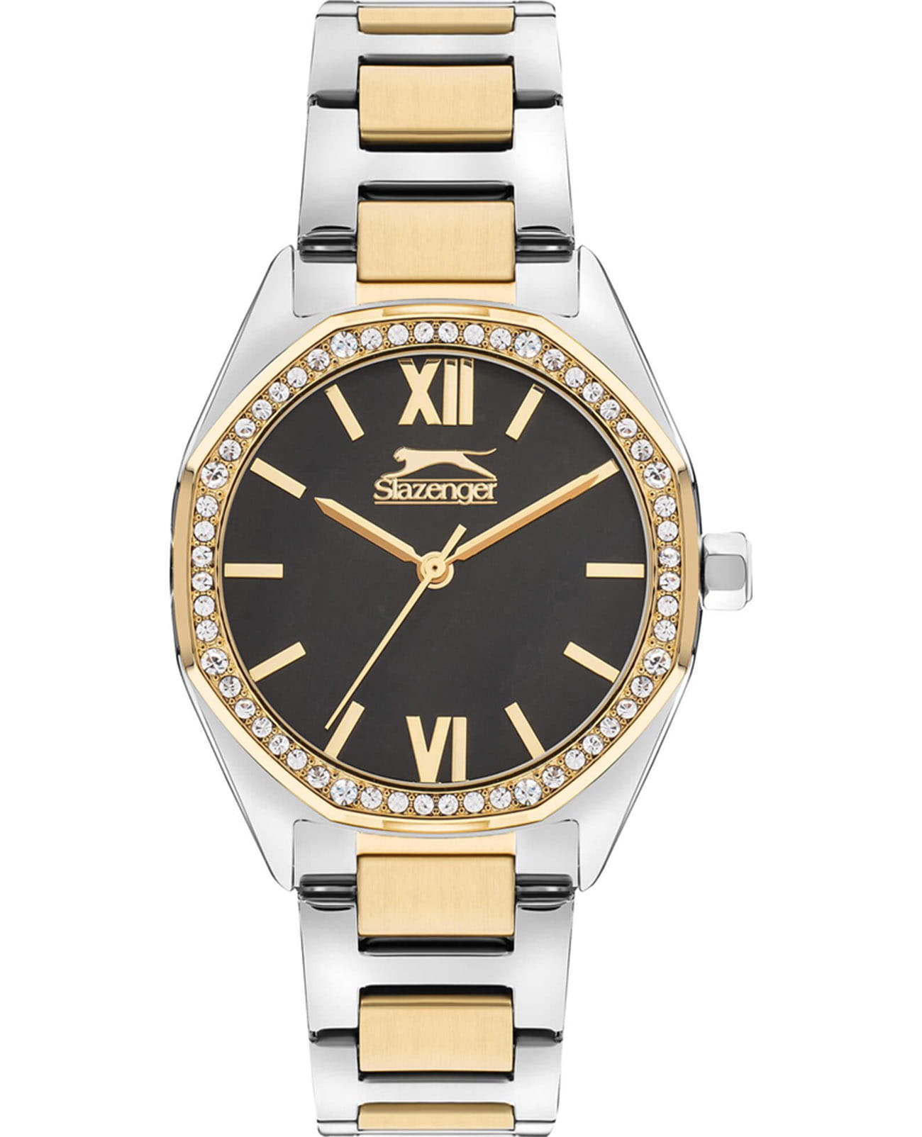 Женские кварцевые часы Slazenger SL.09.2301.3.06 — это элегантный и изысканный аксессуар, подчеркивающий стиль и утончённость. Безель и браслет выполнены из суперметалла с IP-покрытиемIP-покрытиеМетод ионного напыления. Демонстрирует повышенную устойчивость к истиранию, окислению и химическим веществам. Под воздействием высокого давления и температуры около 1500°C молекулы металла надёжно соединяются с частицами корпуса часов., защищён минеральным стекломМинеральное стеклоМинеральное стекло представляет собой искусственно выращенный минерал кварца. Такое стекло отличается особой устойчивостью к повреждениям и царапинам. Уступает по некоторым качествам сапфировому стеклу.. Циферблат чёрного цвета с волнистым рельефным рисунком оформлен штриховыми метками и римскими цифрами VI и XII, дополнен логотипом бренда. Безель гранёный, украшен паве из фианитов, придающих модели изысканное сияние. Заводная головка — граненая, добавляющая детали дизайна. Браслет из суперметалла фиксируется на раскладной застёжкеРаскладная застёжкаТакой тип застёжки используется только на браслетах из металла. Она никогда не раскрывается полностью, происходит разделение на 2 и более частей. Раскладывающая застёжка снизит вероятность потери часов к минимуму., обеспечивая надёжность и комфорт ношения. Водонепроницаемость 30 м позволяет использовать часы в повседневных условиях, защищая от случайных брызг и капель дождя. Модель идеально подходит как для повседневного, так и для торжественного образа.